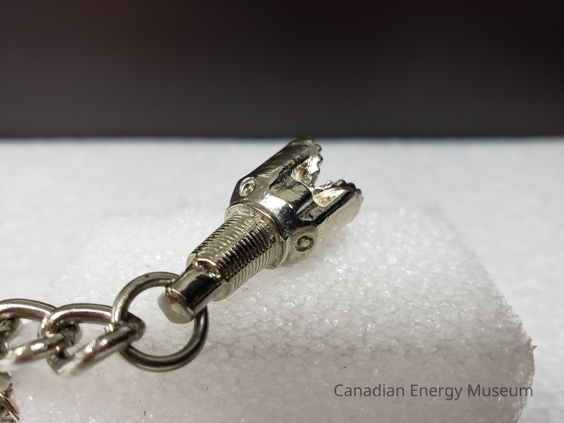 Drill Head Attachment: A 3D cast of a drill head of the milled-tooth design. It is attached to the central keyring via two jump rings and a wide-link curb-style chain.