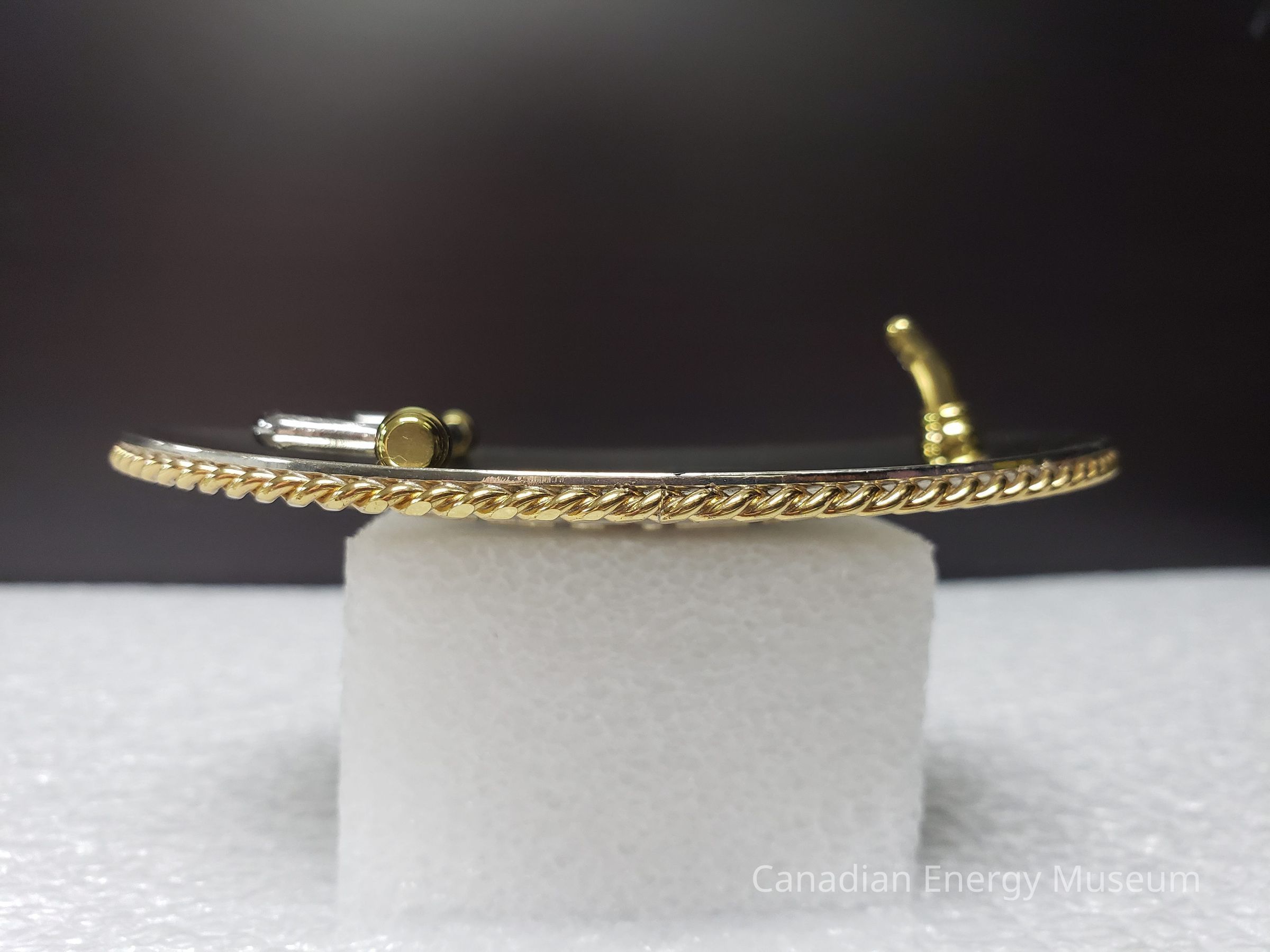 Back Elements: The back is smooth and mirrored, with an open hinge and curved hook (gold). The hinge (silver) is "U" shaped with turned-out ends that connect into two bases at the top and bottom (gold). At the bottom of the back is an impression with the maker's mark in an oval ring. Maker's mark reads "OLSON (.COM) BUCKLES; MADE IN CANADA" with outlines of maple leaves on either side of "BICKLES"Collection