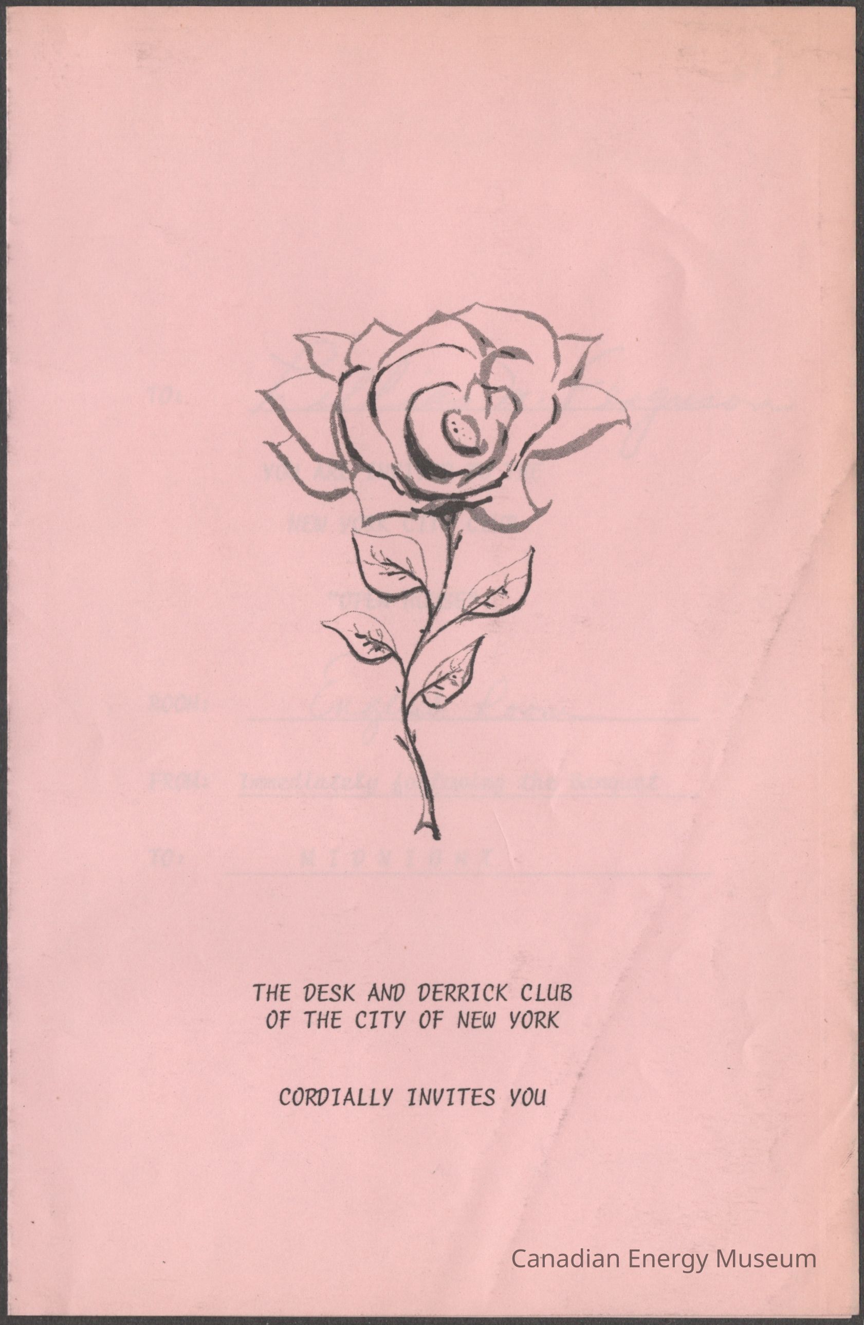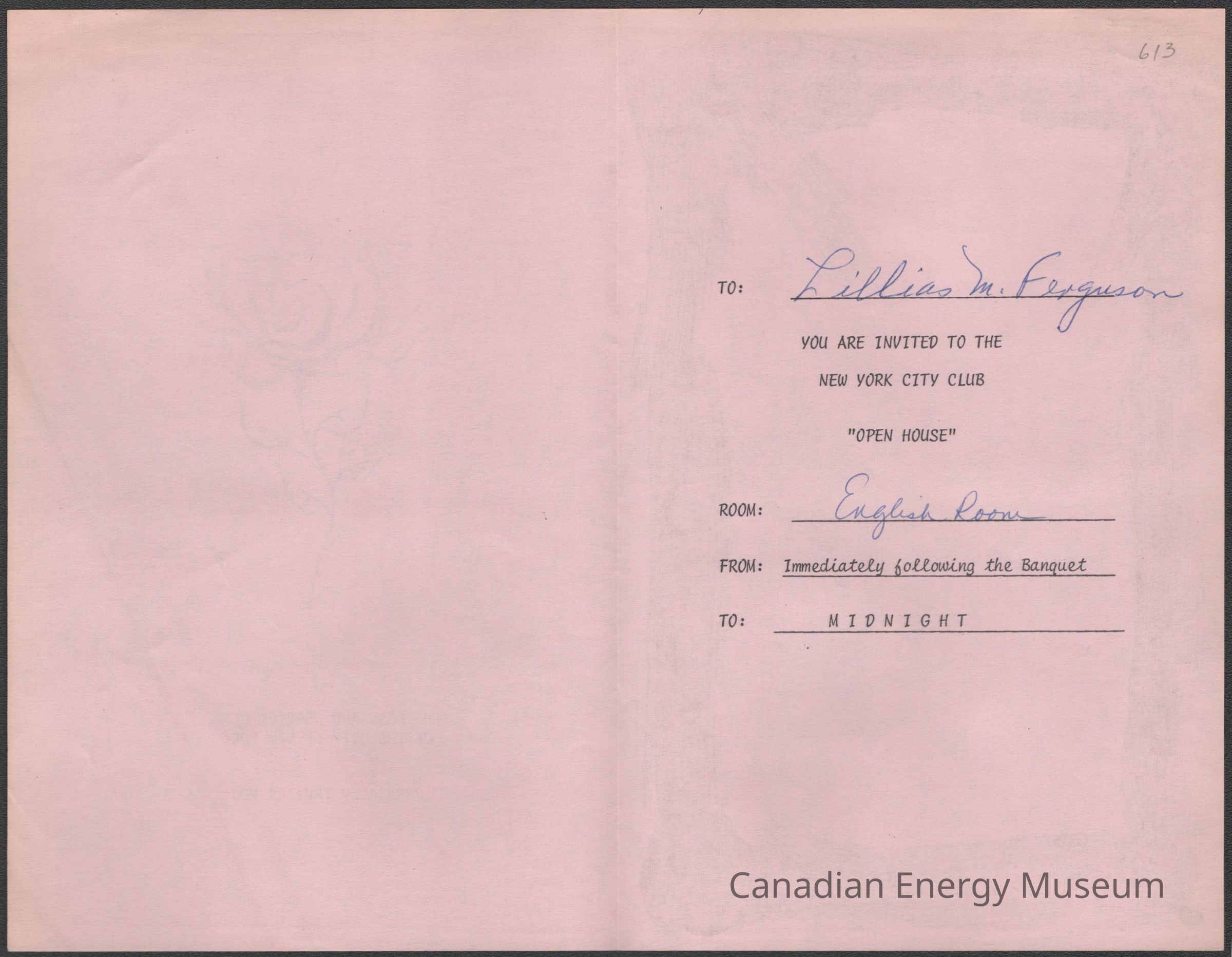 An invitation for the New York City Club "Open House" event (English Room, September 1972), addressed to Lillias M. Ferguson; as part of the Association of Desk and Derrick Clubs Convention, 7-9 September 1972. The cover has an illustration of a rose and the text "The Desk and Derrick Club of the City of New York: Cordially Invites You". The inside has a simple pre-printed invitation form, filled in with blue ballpoint pen.