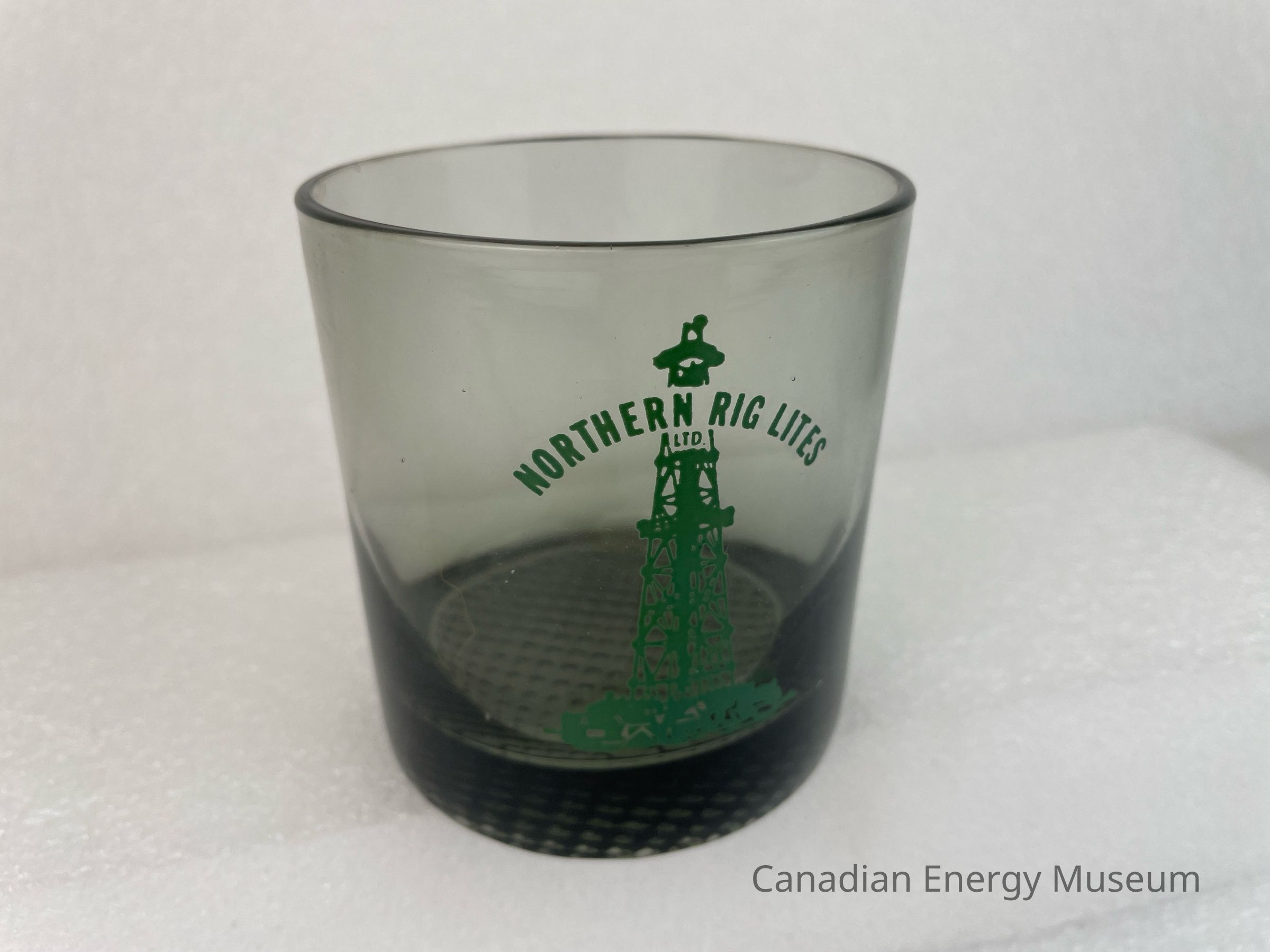 A black, translucent whisky glass branded to Northern Rig Lites Ltd. The front of the glass features a green illustration of an oil derrick. Running through the top of the derrick is arched green text reading, "NORTHERN RIG LITES LTD". The bottom of the glass is textured with small circular indents.Collection