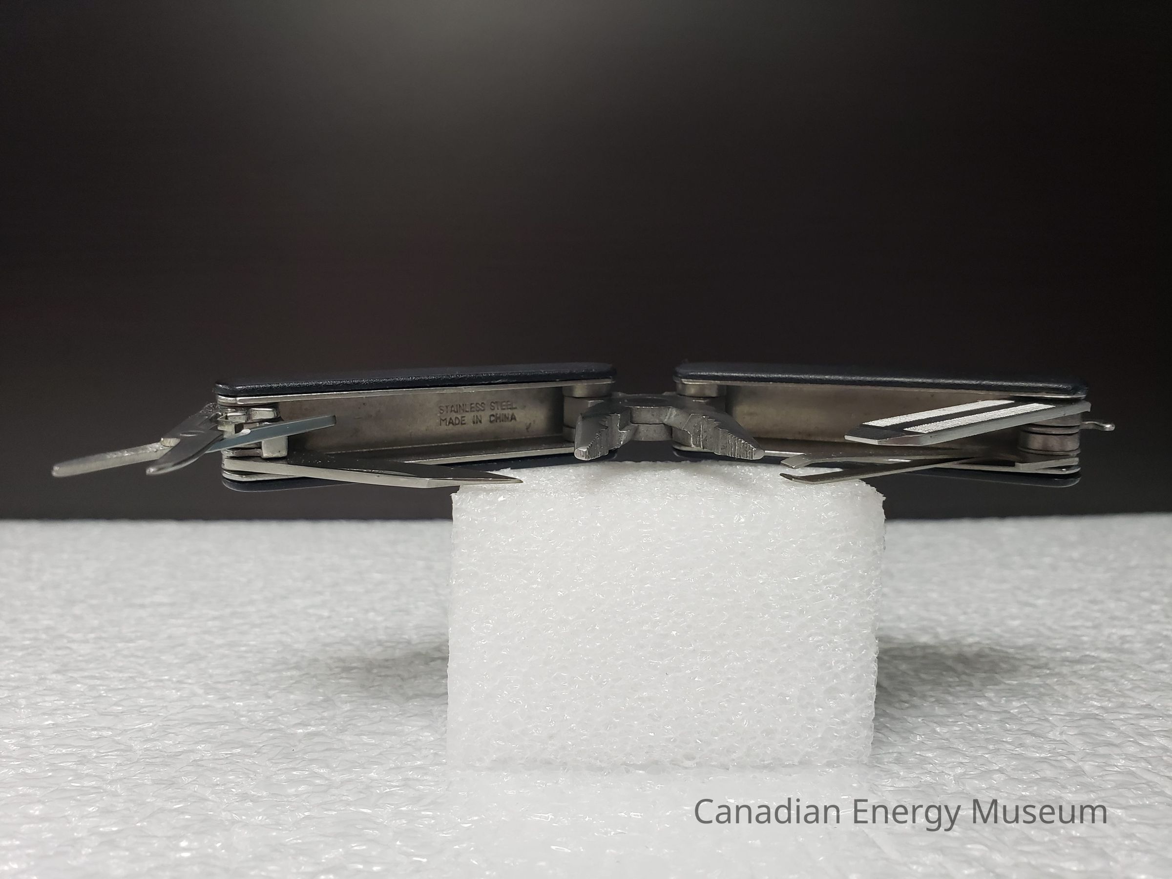 Old Description (Kelsey Steil, 6/1/2022): Pocket knife with black plastic handle. Contains pliers, file, knife, tweezers, and scissors. Text on side advertises AllTrade.Collection