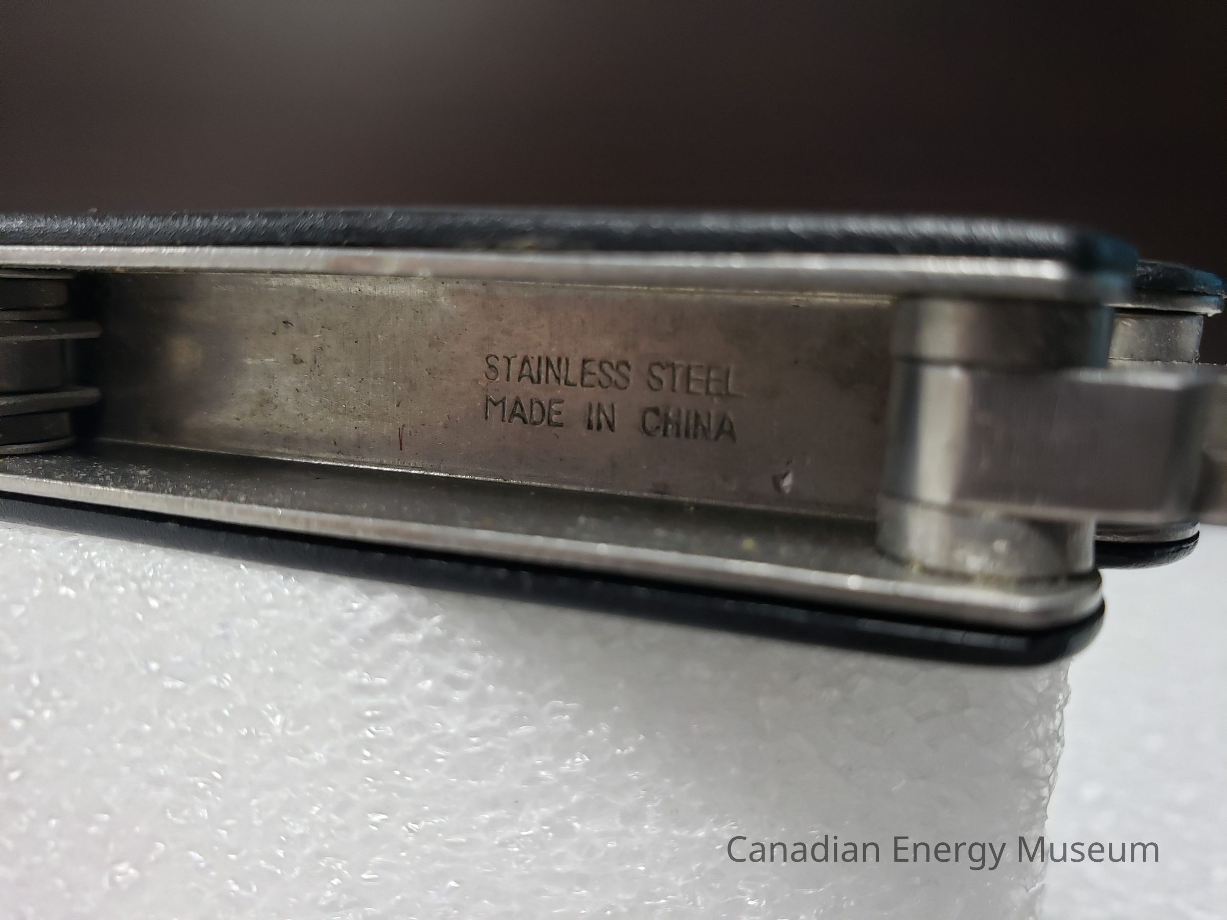 Inside of the handle where file is has text etched in saying "STAINLESS STEEL MADE IN CHINA"