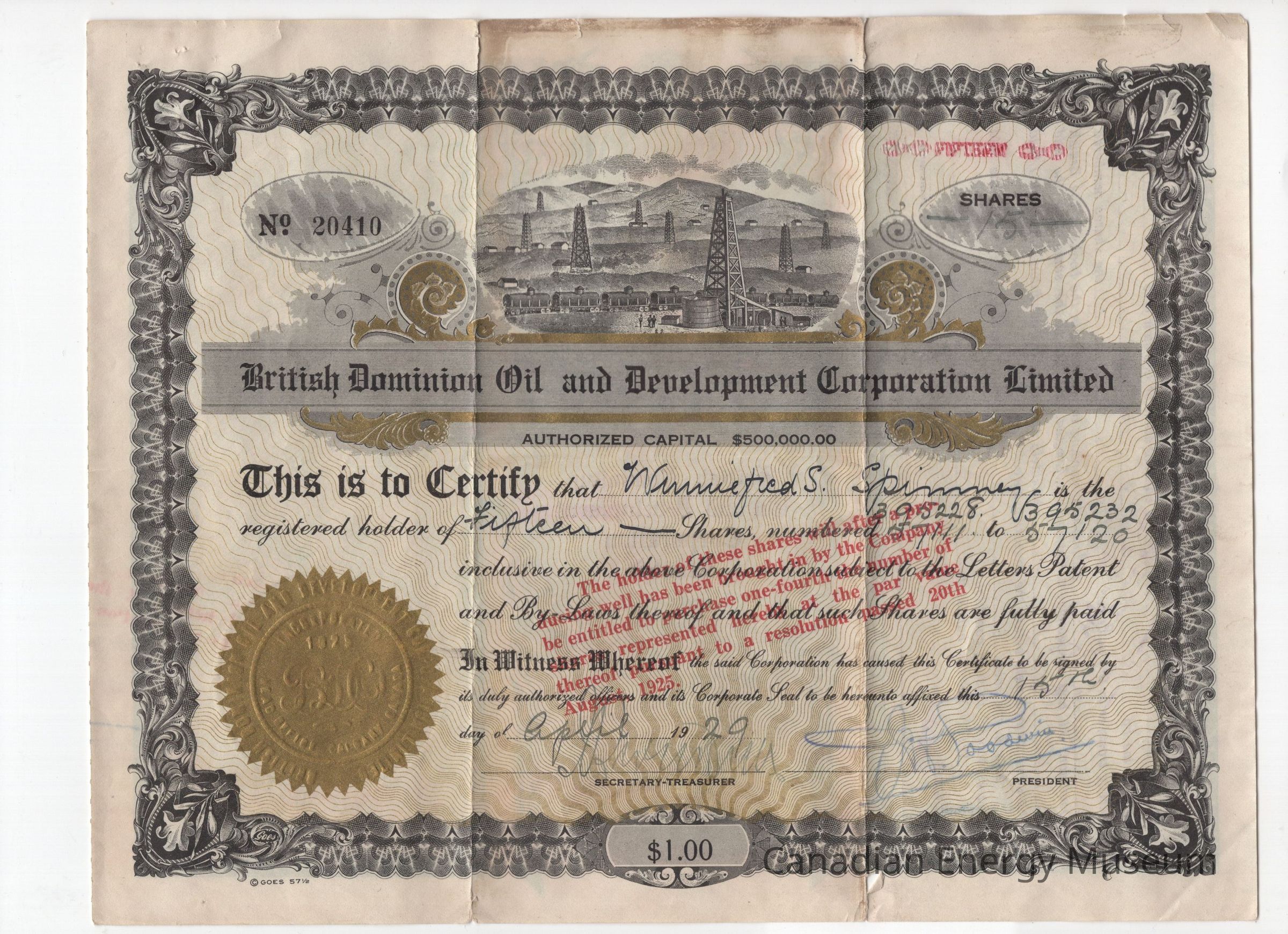Share Certificate, Certificate, 1920s, Gold, Mining, Black, British Dominion Oil and Development Corporation Limited, Oil, GreenDescription