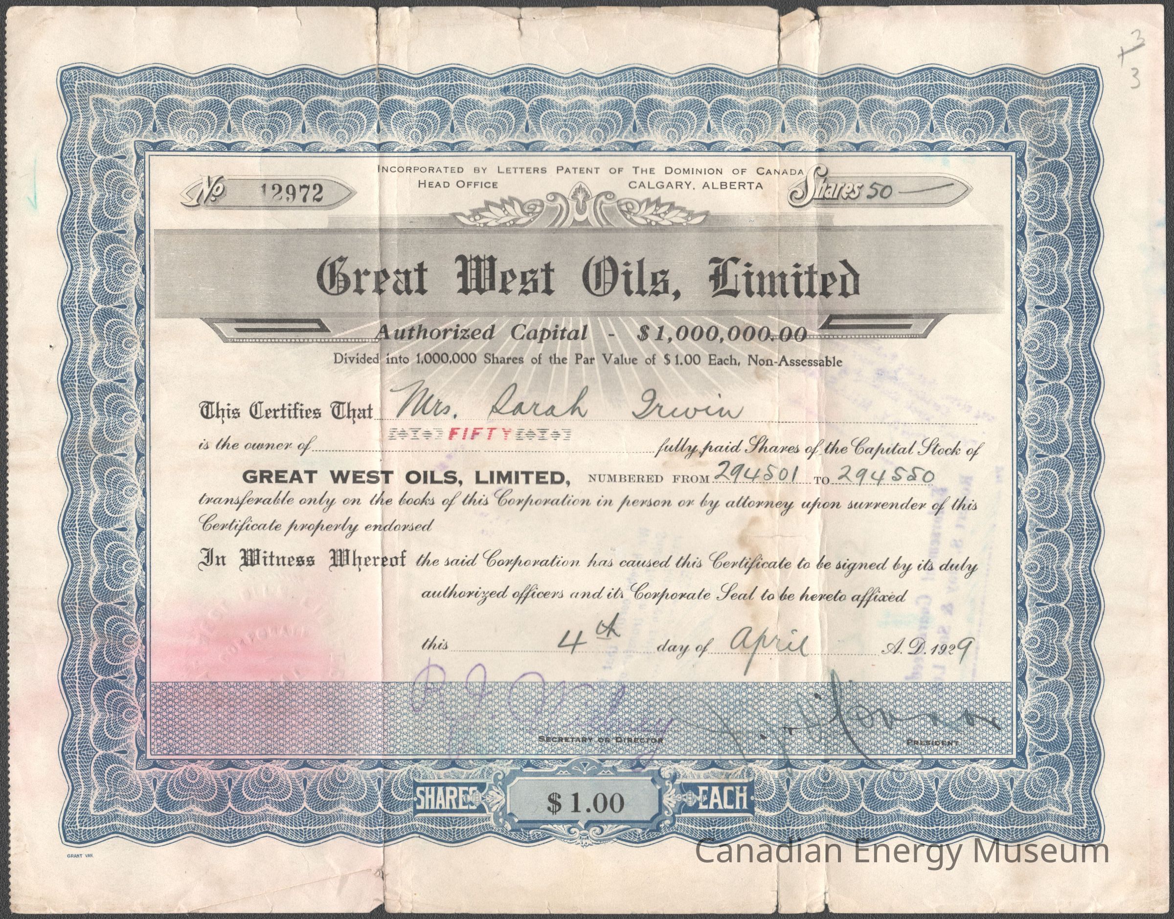 [Share Certificate] Great West Oils Limited, 50 Shares, 4 April, 1929Entry/Object ID