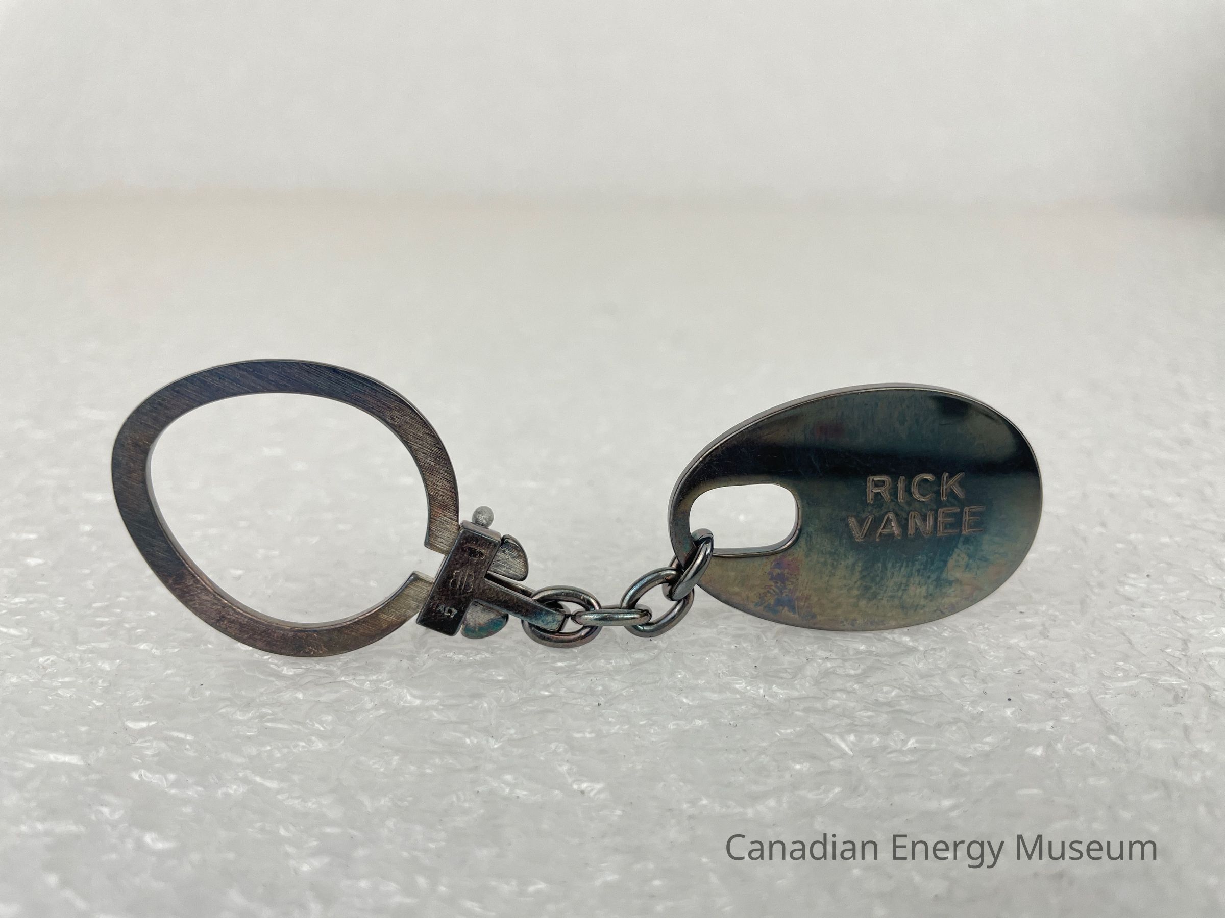 Description: An oval-shaped metal fob on a keychain. The fob is a silver-coloured metal, with a large, rounded rectangle cut-out for the keychain attachment. The fob displays a metal logo for Tri-City Drilling (1968) Ltd and features stylized text, "Tri-City" with the tail of the "y" creating a slanted rectangle displaying text, "DRILLING 1968 LTD." An oil derrick is layered underneath the "T" in "Tri-City". Underneath the metal logo is text etched into the fob reading, "SAFETY AWARD". The back of the fob features etched text reading, "RICK VANEE".