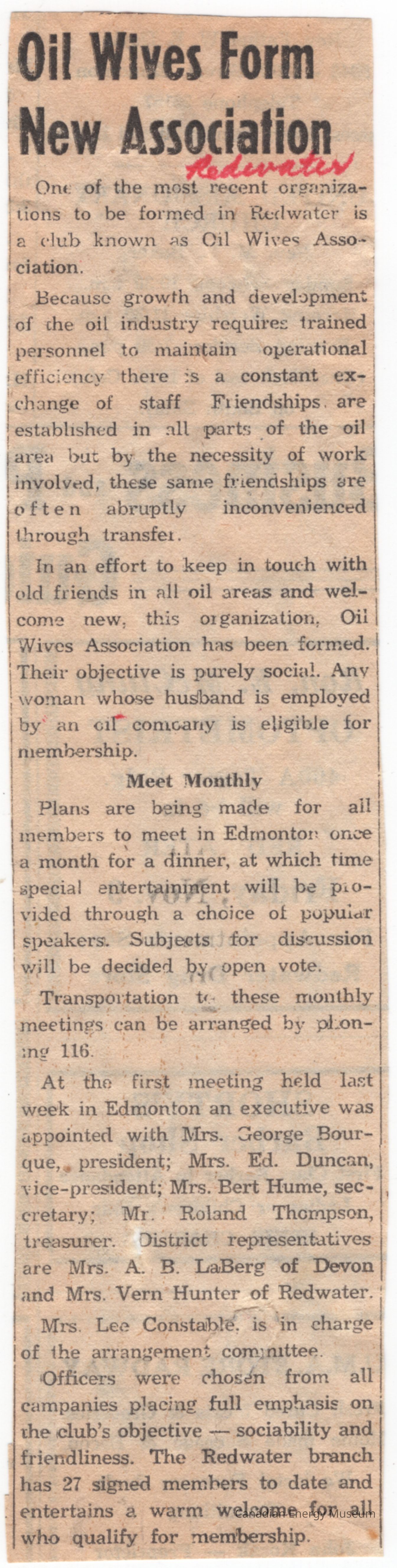 [News Clipping] "Oil Wives Form New Association", RedwaterEntry/Object ID