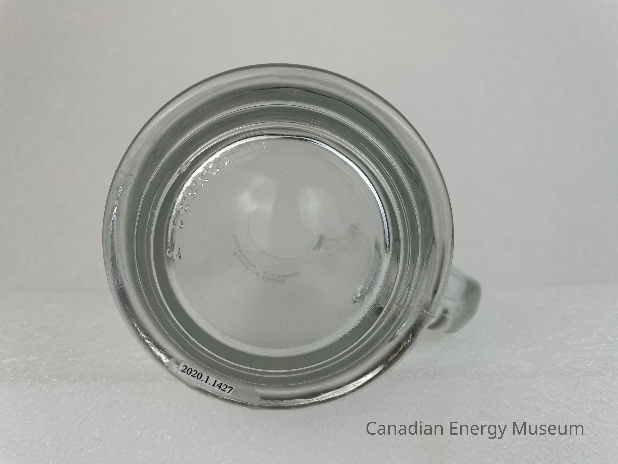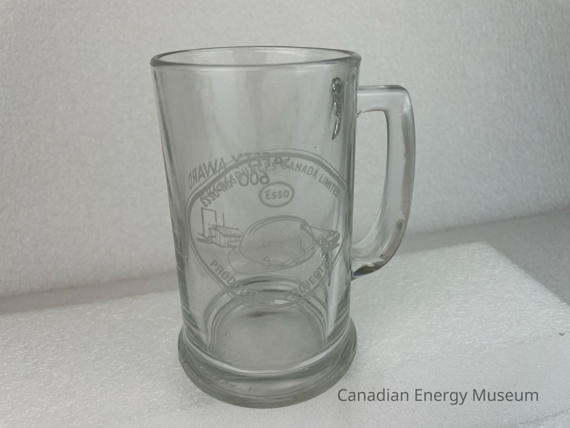 A clear glass tankard with a handle branded to Esso Resources Canada Limited. The front of the glass features a matte oval shape with an illustration of a large hard hat with a smaller illustration of machinery carrying a tree log. Behind the hard hat is a small building, and above the hard hat is an Esso logo. The top and bottom interior of the oval displays matte text reading, "ESSO RESOURCES CANADA LIMITED / PRODUCTION PROJECTS". The back of the tankard features large text reading, "SAFETY AWARD 600 Hours". The bottom of the tankard slants outwards and rests on a smaller base. The bottom of the base has raised text reading, "CANADA 15".Collection