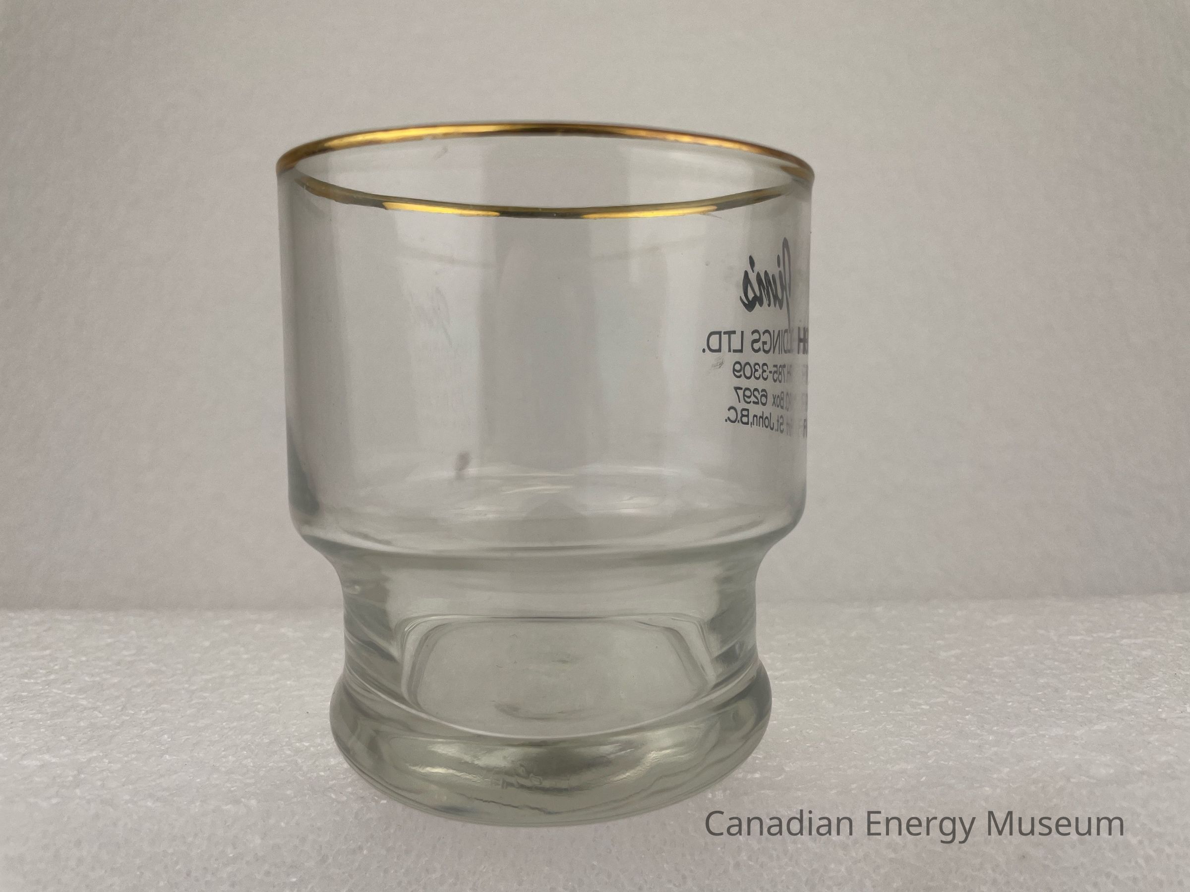 A clear whisky glass with a gold rim branded to Jim's Holdings Ltd. The body of the glass is slightly curved and has a smaller footed base. The design features cursive black text, "Jim's", and smaller, black, sans-serif text underneath that reads, "HOLDINGS LTD. / PH. 785-3309 / P.O. Box 6297 / Fort St. John, B.C."Collection