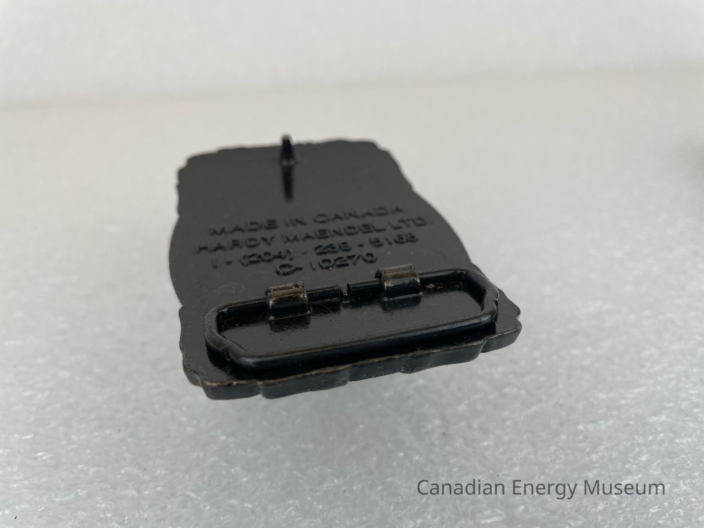 Front Design: A large, rounded rectangle of black enamel is displayed on the front. A gold outline of a rectangle with curved sides, and the lower 1/3 portion being filled in with gold. The top of the rectangle displays red text outlined in gold reading, "EDCON" and gold outlined text underneath reading, "POWER TONG SERVICES LTD." with a gold derrick layered underneath the red "C". The lower half of the rectangle features black text reading, "PHONE 623 - 4808 / LAC LA BICHE, ALBERTA". The border of the buckle is antique-bronze and features two scroll shapes placed on each corner.