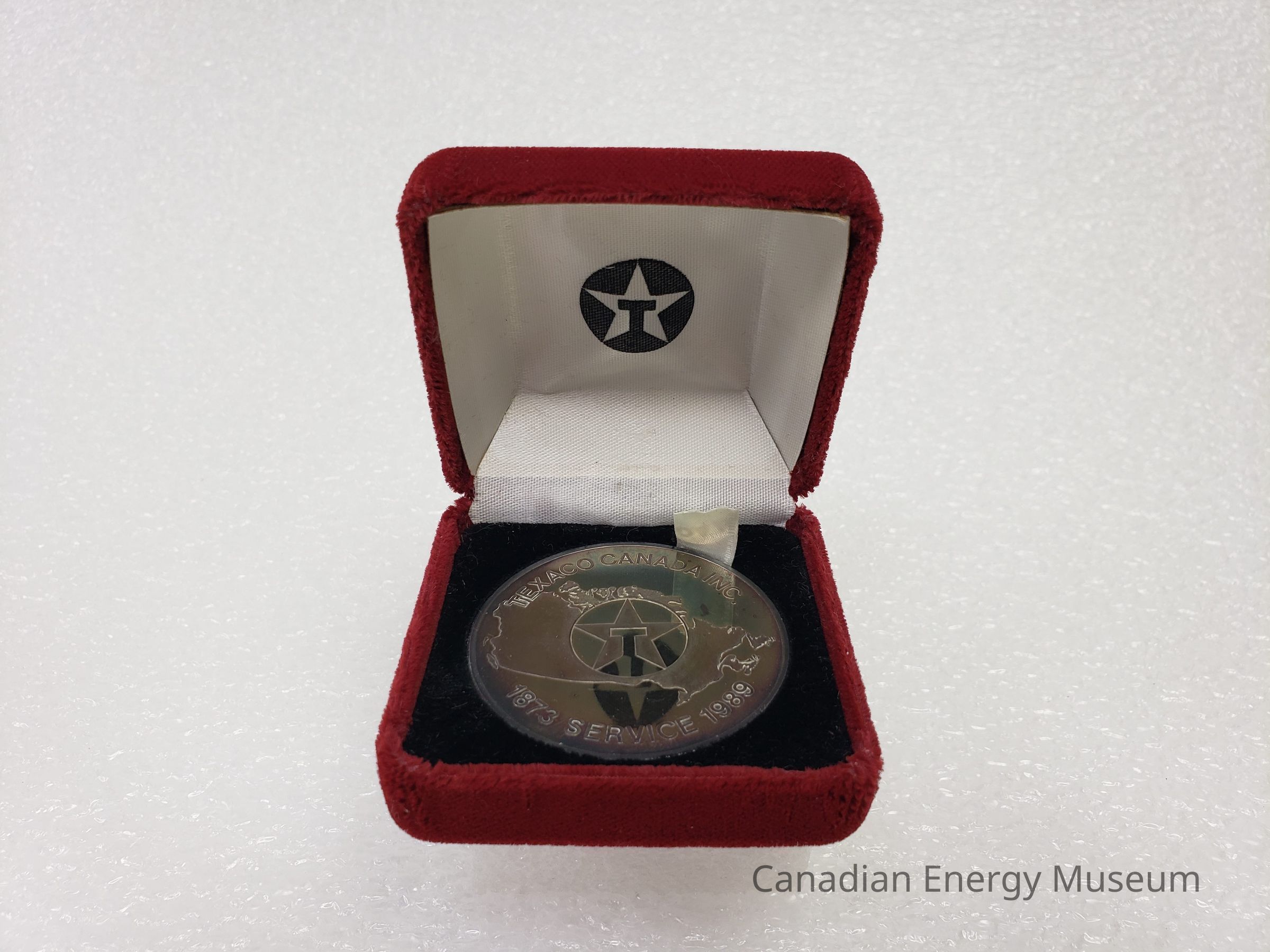 Old Description (Kelsey Dalrymple, 2/10/2020): Commemorative Texaco coin in red felt box. One side is engraved with a map of Canada, with the Texaco logo in the centre. It reads "TEXACO CANADA INC / 1873 SERVICE 1989" The verso is engraved with an Indigenous man wearing a headdress, beside the Texaco logo. The border is engraved with the different names Texaco operated under in Canada before becoming Texaco.Collection