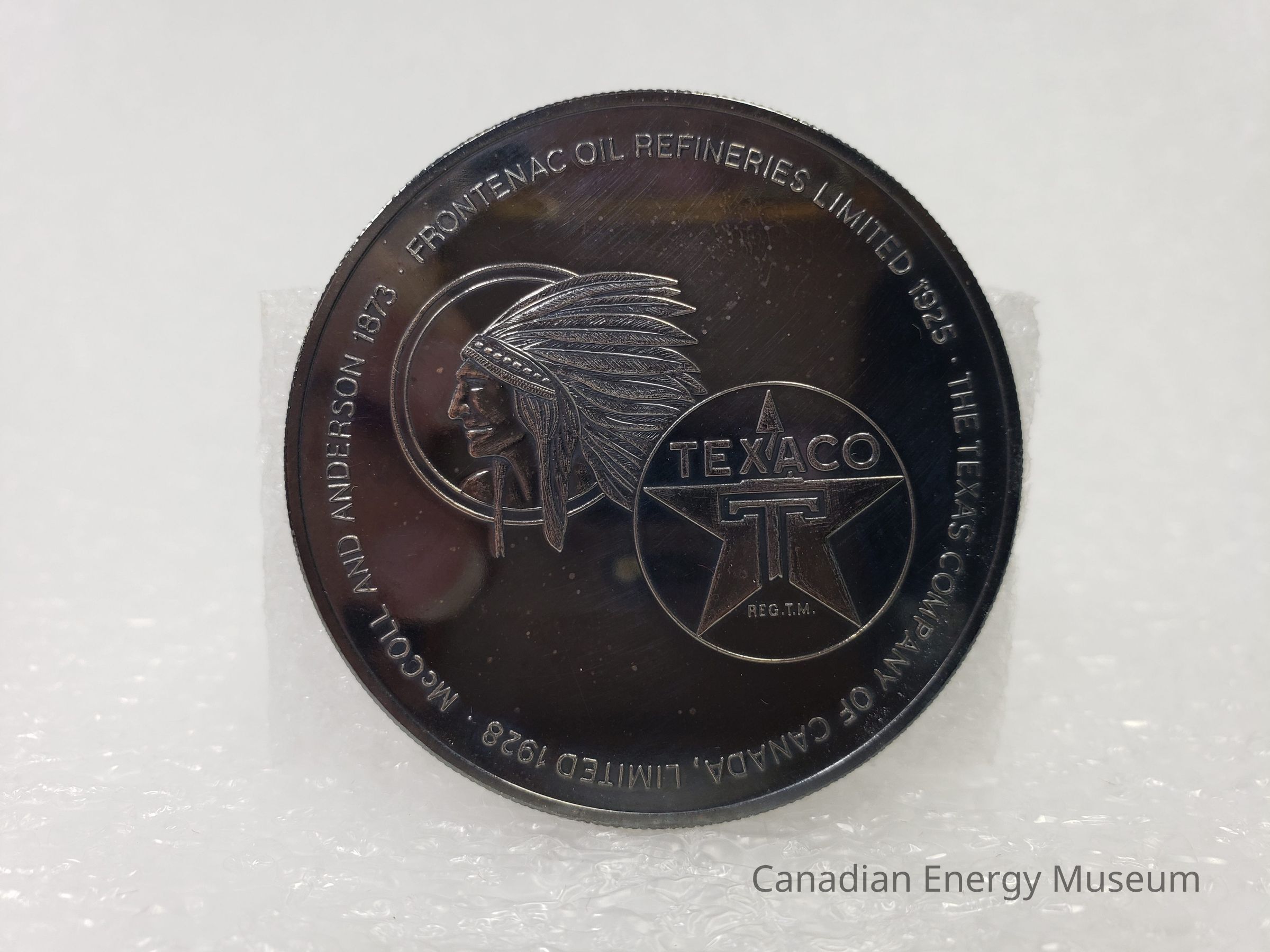 Coin, Commemorative Coin, Commemorative, Texaco, Texaco Canada, Metal, Silver, Red, Black, White, Textile, 1980s, 1870's, 1920s, McColl and Anderson, Frontenac Oil Refineries Ltd., The Texas Company of Canada Ltd.Description
