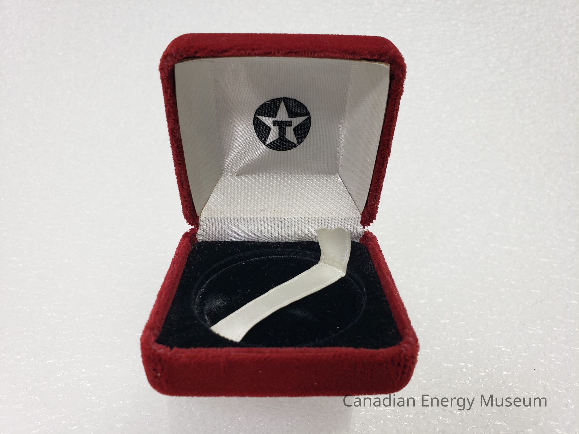 This is a clam-shell 'ring box' style case, with a red velvet/flocked outer fabric, a black velvet/flocked interior of the bottom, and white satin lining on the interior of the top. In the centre of the top's interior is printed the Texaco round start logo in black. The interior of the base is formed to hold the coin, with a cream satin ribbon beneath the coin for easy removal. The hinge is a silver-coloured metal, with seven joints.