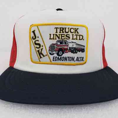 A trucker-style cap, branded to J.S.K. Truck Lines Ltd. (Edmonton, Alberta).