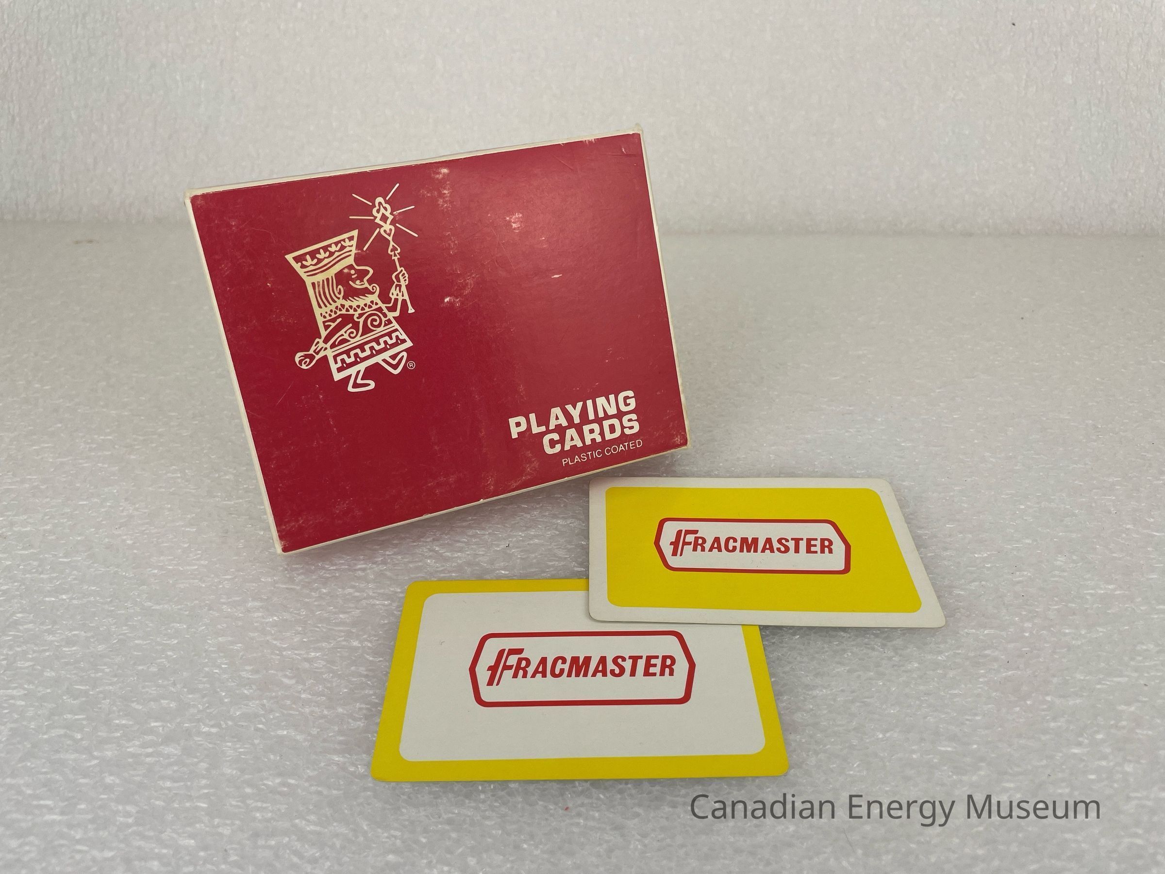 Playing Cards: The two decks have identical but colour-opposite designs. The base is either yellow or white, with the opposite colour on the border, with a red logo branded to Fracmaster.