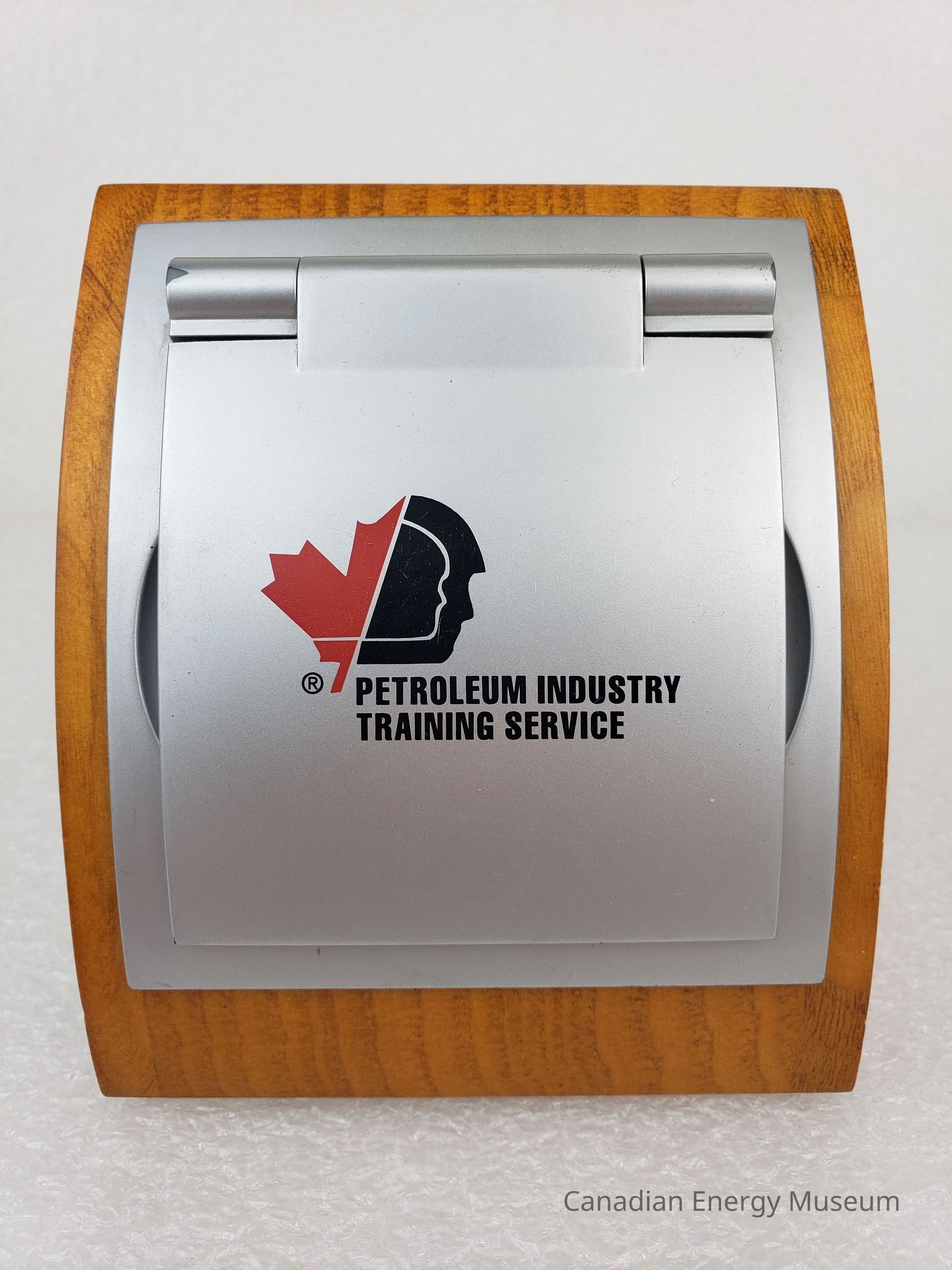 Description: A digital combination calendar, calculator, and alarm clock, mounted on a wooden block. The device has a silver plastic clam-shell design, on the top of which is the logo (half red maple-leaf, half a face within a face in black) and text name of "Petroleum Industry Training Service". When opened, the device has a display screen and five buttons on the lid, and a grey keypad on the base. When closed, the device has a curved shape, which matches the curve of the wooden mount. The device rests inside a cut-out in the wooden base, inside which is a set of printer user's information (the device rests in the groove, but is not secured in place). The underside of the wooden base has four small foam feet.