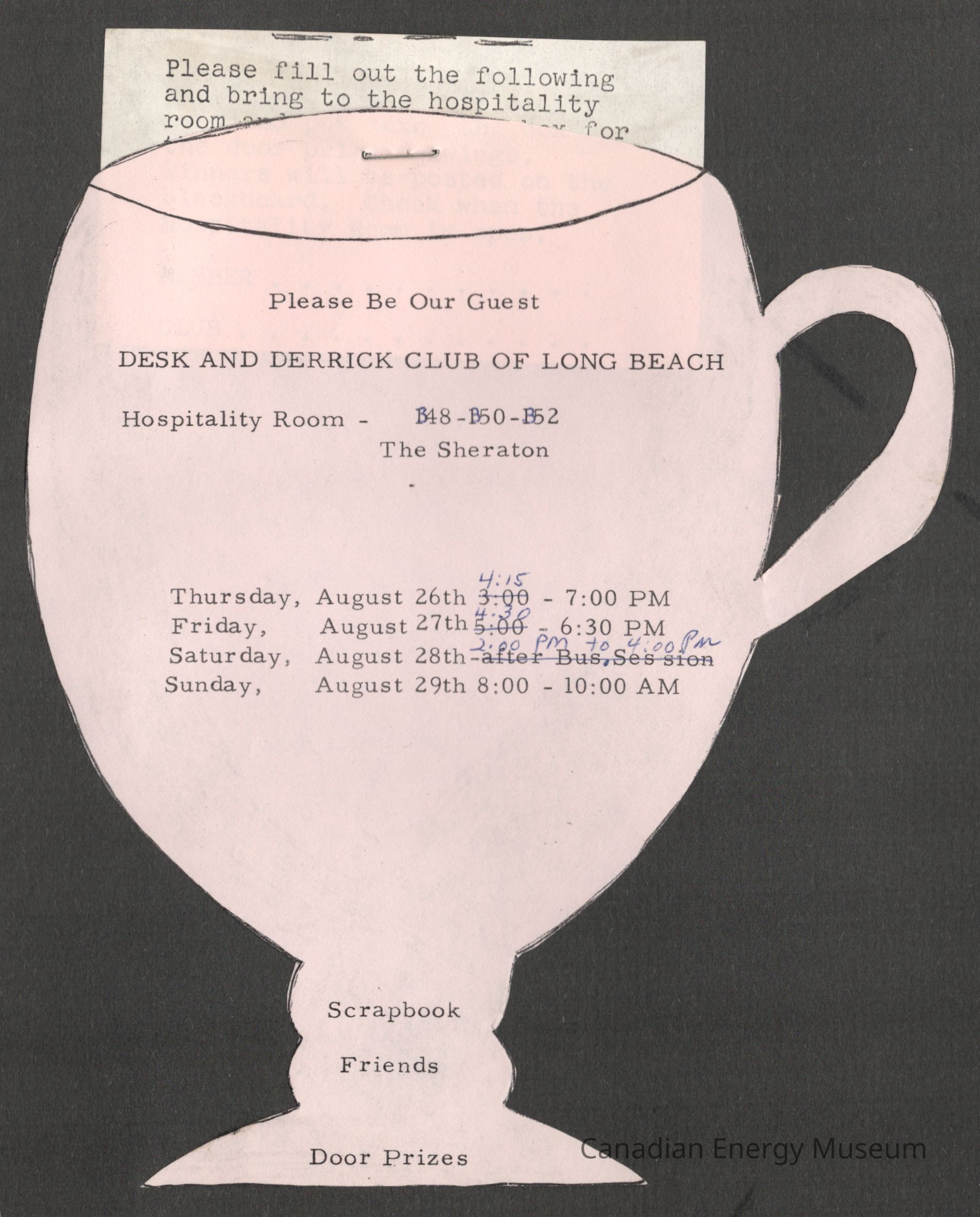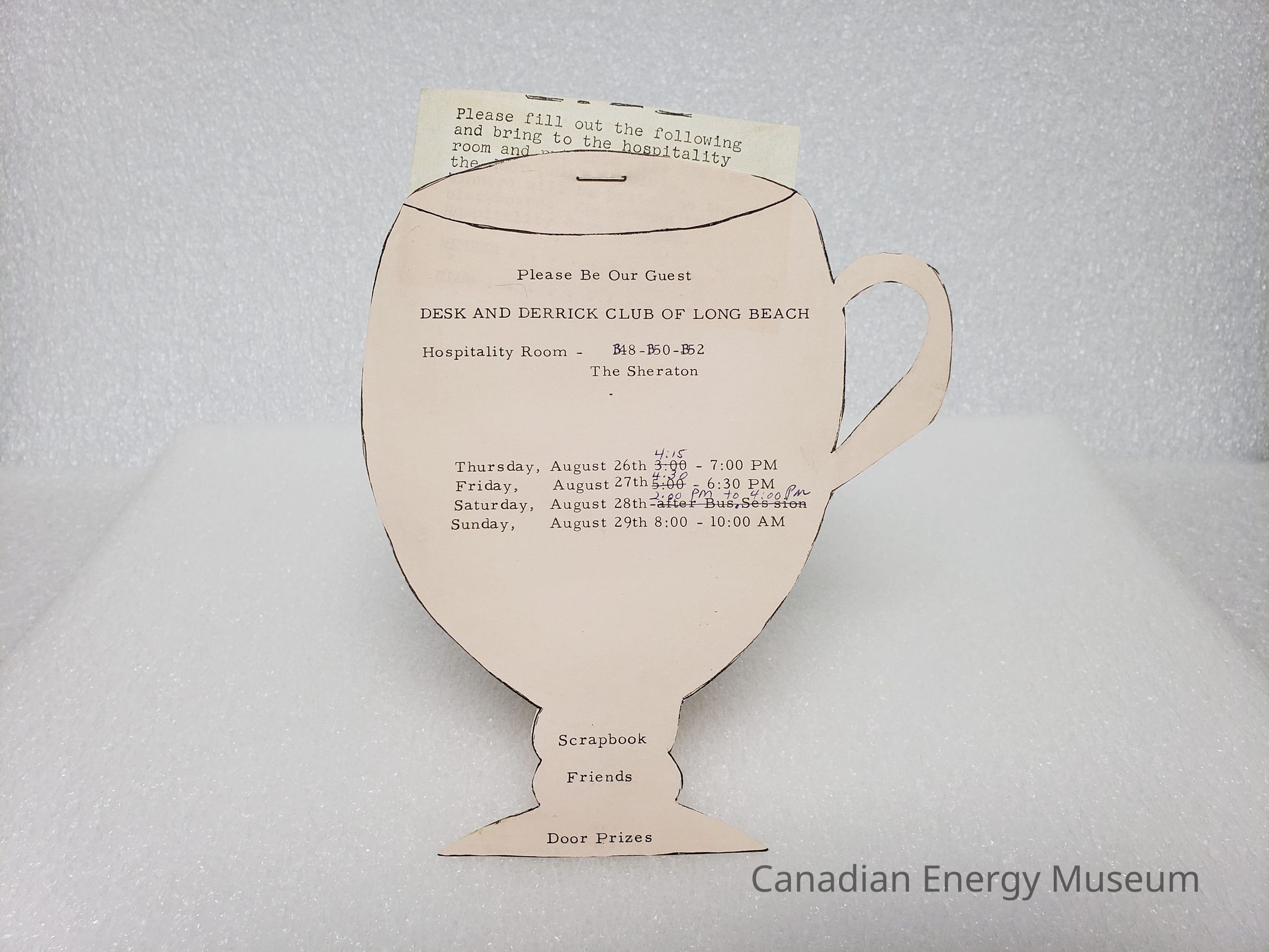 An invitation, in the shape of a goblet/cup, for an event held by the Desk and Derrick Club of Long Beach, at the Sheraton (San Diego) on evenings of 26th-29th August 1971. Some details have been corrected with a blue ballpoint. Attached by staple is a small typewritten note on white paper.