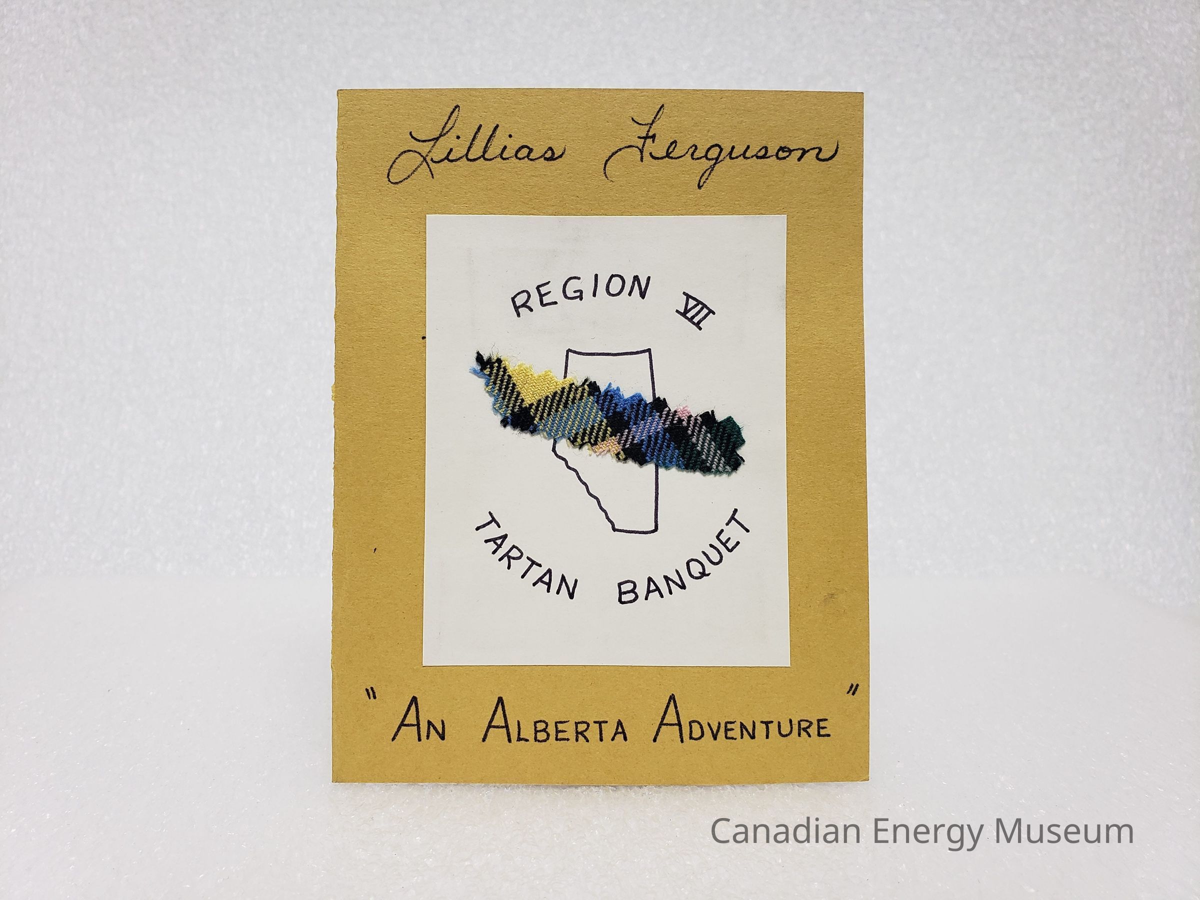 A place card (styled like a greeting card) made out to Lillias M. Ferguson. Handmade with handwritten (in black ink) text reading "Lillias Ferguson; REGION VII TARTAN BANQUET; "AN ALBERTA ADVENTURE"". The card base is a mustard-yellow textured cardstock, at the centre of the cover of which is adhered a white rectangle of paper, onto which is adheres a strip of multi-coloured tartan fabric with zig-zag cut edges. Behind the tartan fabric is a simple outline of Alberta. The interior is blank.