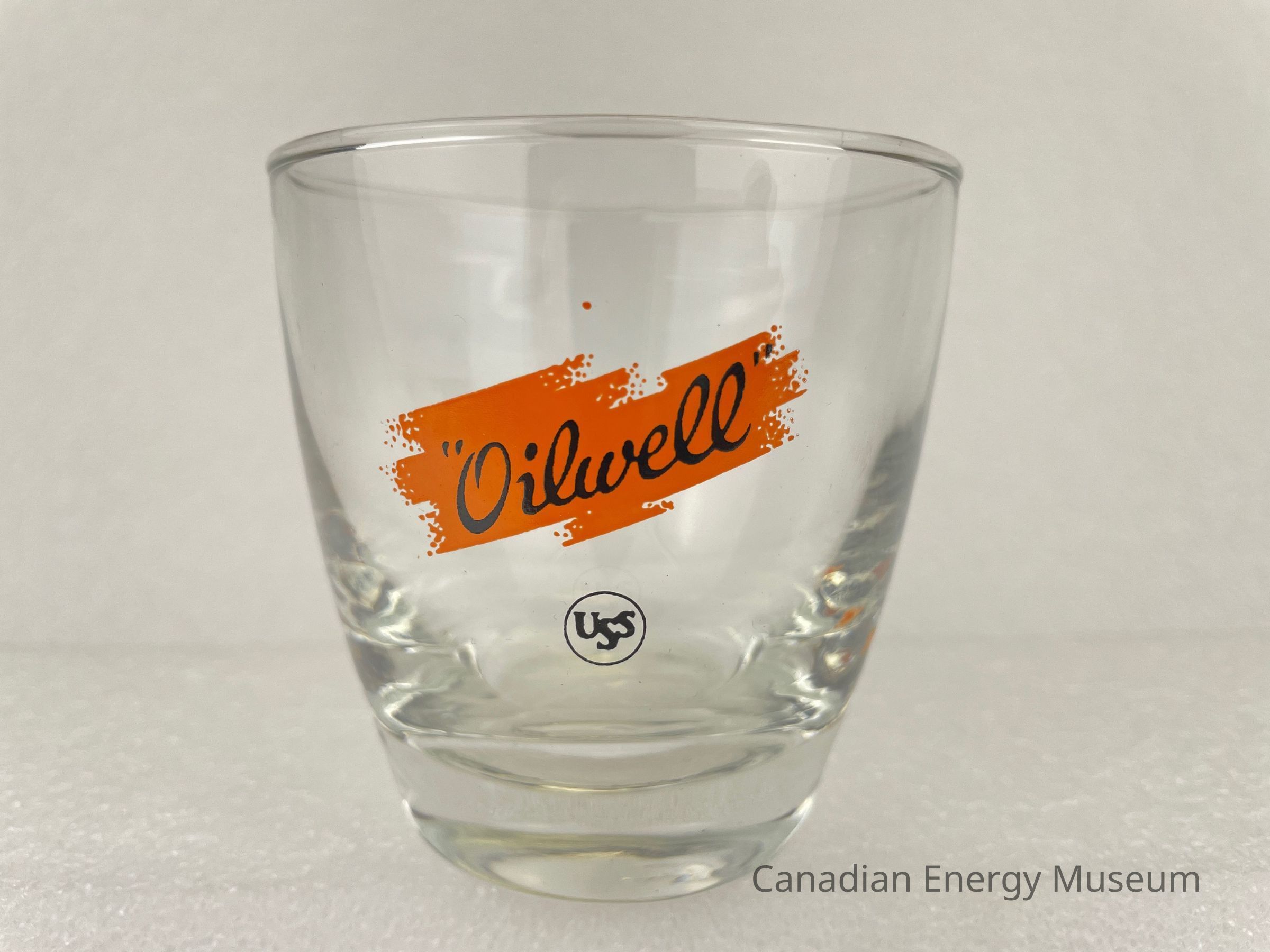 This glass is an angled rocks/old-fashioned drinking glass made from clear glass, with a printed design on one side. The heavy bottom is narrow, with the sides angling outward in a smooth curve, with a slight rounded lip at the top. The printed design consists of a stylized splash of orange, over which is the black script text "Oilwell", below is a smaller ring inside which is the stylized text "USS". The glasses likely date from the mid-1950s to the 1960s, based on the maker's mark ("L" within a circle, which began use in 1955) and dating of similar glasses.Collection