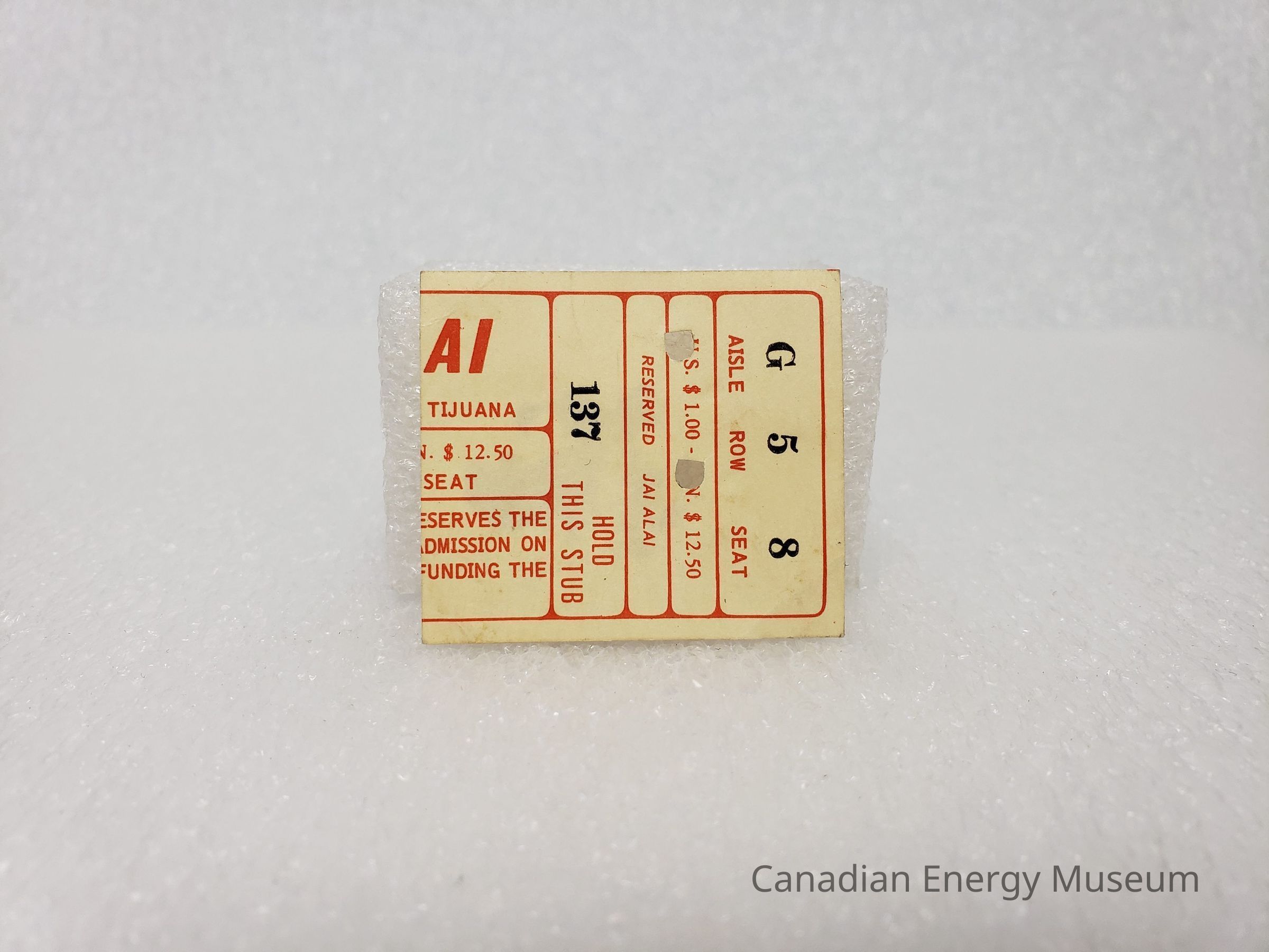Ticket stub from a jai alai game. Ticket is number 137, and the holder had the following assigned seat: Aisle G, Row 5, Seat 8. Item is connected to the 1972 Association of Desk and Derrick Clubs of North America's 20th Annual Convention in San Diego. It is assumed that Lillias Ferguson and other convention attendees attended the match.
