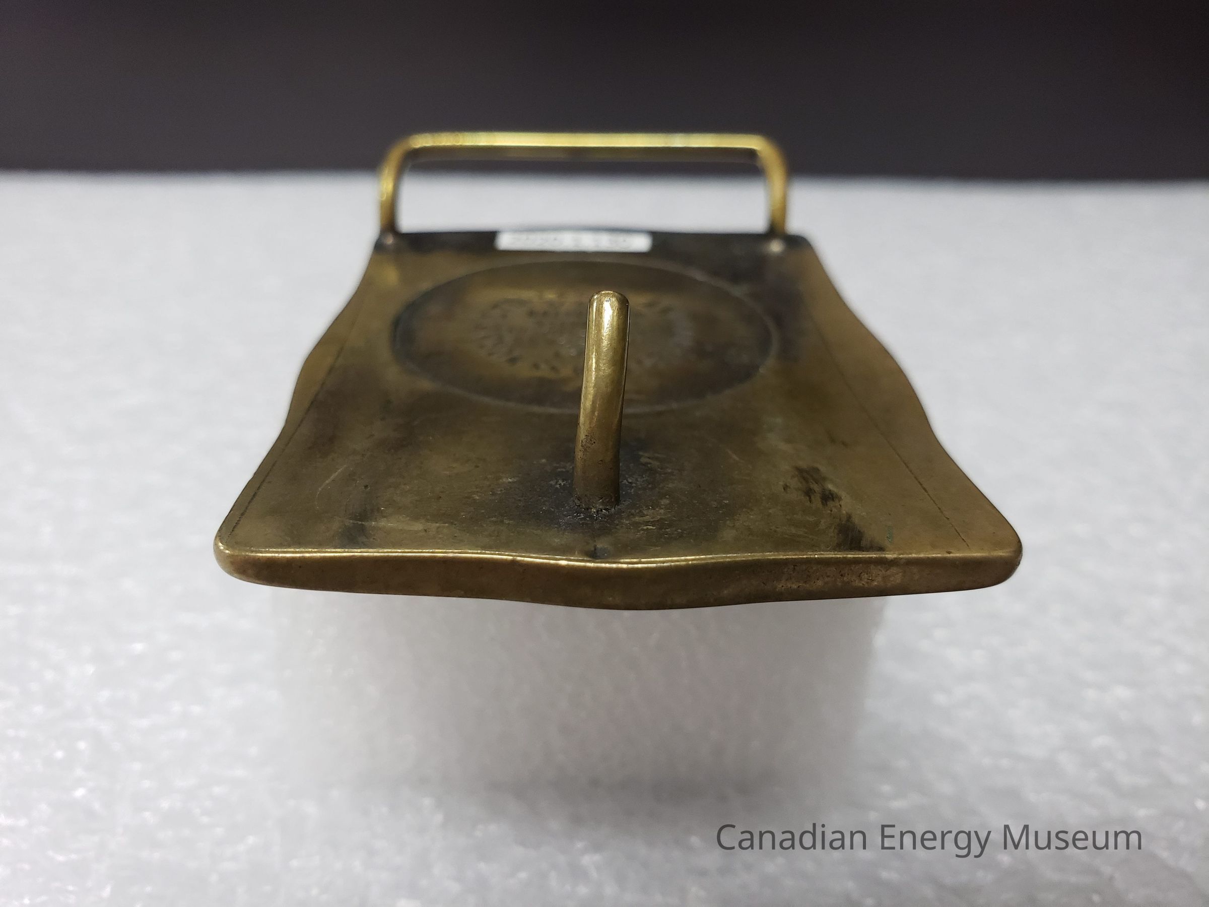 Features: An overlapped curved-rectangular and oval-shaped, cast brass belt buckle, finished in antique-bronze and bearing the imagery of oil equipment and text. The buckle is lightly curved.