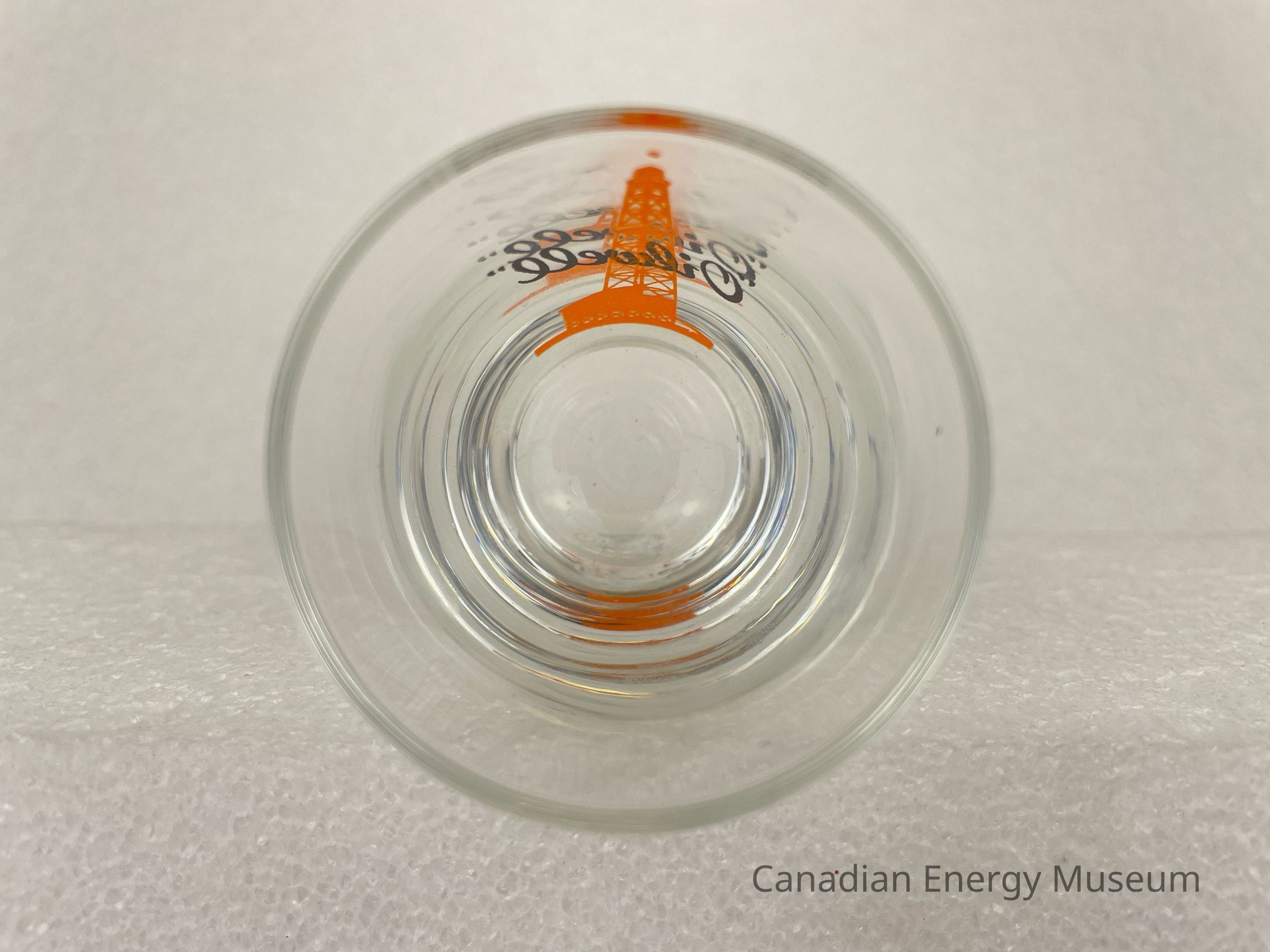 This glass is a clear shot glass with a printed design on one side. The glass is angled outwards at the top, with a heavy base. The printed design consists of an orange oil derrick, over which is black script text ""Oilwell"". The glasses likely date from the mid-1950s to the 1960s, based on the maker's mark ("L" within a circle, which began use in 1955) and dating of similar glasses.Collection