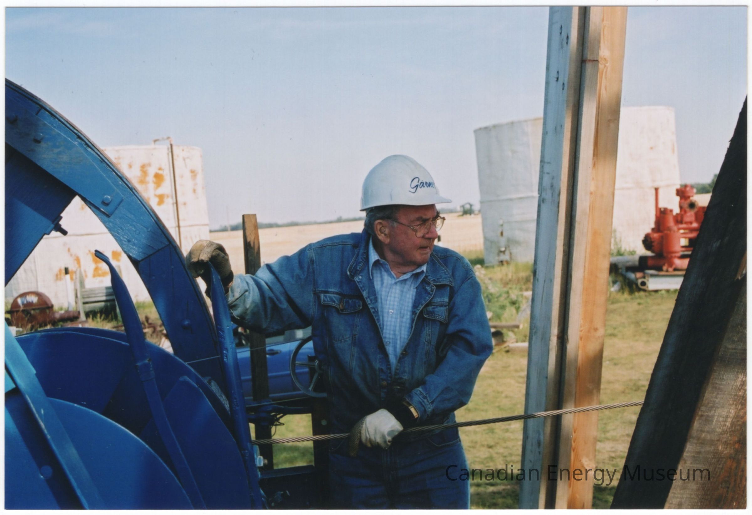 Photograph Description: A man working on the installation of the wooden cable rig, besides the Leduc #1 Energy Discovery Centre (now the Canadian Energy Museum). The man on the right is dressed in a white hard hat reading "Garnet", a blue checkered button-up shirt beneath a blue denim jacket, blue denim pants, and work gloves. He is resting his right hand on a lever and hid left on a length of cable.