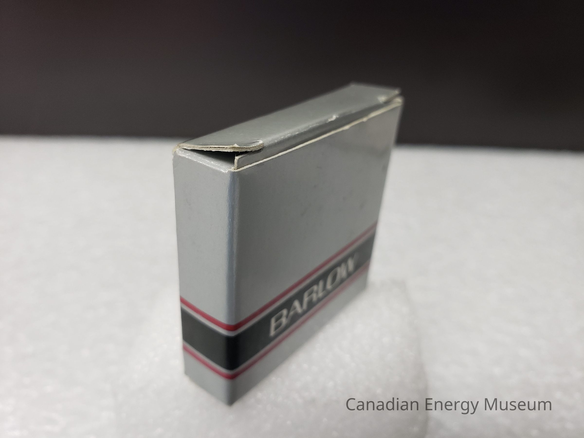 Box: Box is original to the maker of the tape measure, branded to Barlow. Box is a thin cardboard and open on both sides to make flat. The box is a metallic dull silver as the main colour and has three stripes parallel to each other running the whole way round the box on the bottom half. The top strip is thin and red the black stripe is thick, roughly a 1 cm wide and the bottom is also a thin red stripe. All the stripes are separated by the same muted metallic silver. The text "BARLOW' is inside the black stripe on either square face, running the same directions as the stripes. Inside of the box is white.