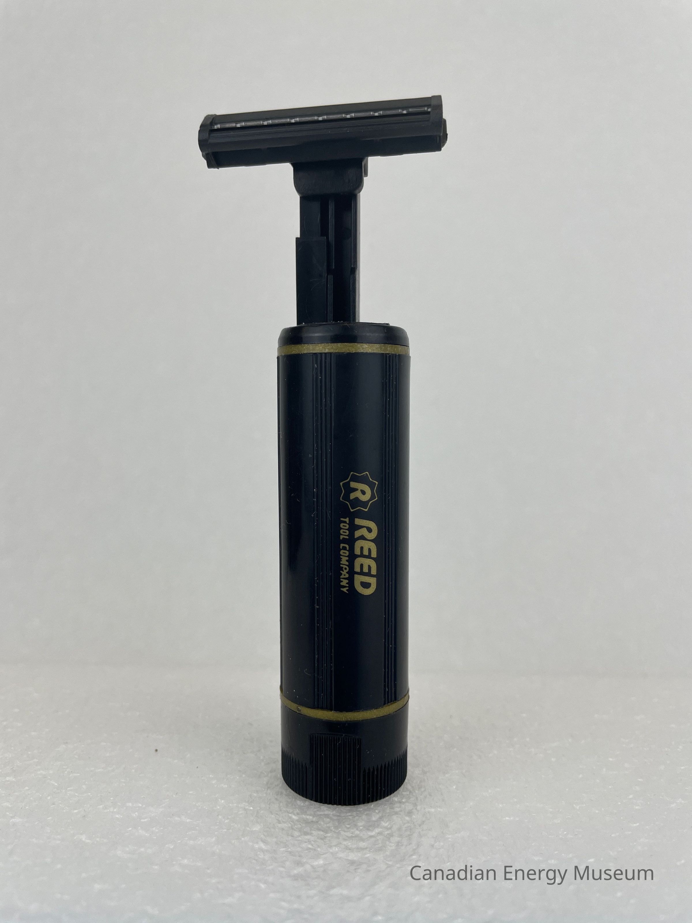A plastic, black razor is contained in a cylinder. The body of the cylinder is black with two thin gold bands, one placed at the top and one at the bottom. A small, gold logo is placed in the middle of the body with text that reads, "REED TOOL COMPANY", and to the left, a gold "R" is placed in the middle of a starburst outline. Six groups of three grooved lines run vertically along the body of the razor. The bottom of the razor features debossed illustrations of how to twist and open the razor. The razor is black with two metal blades.