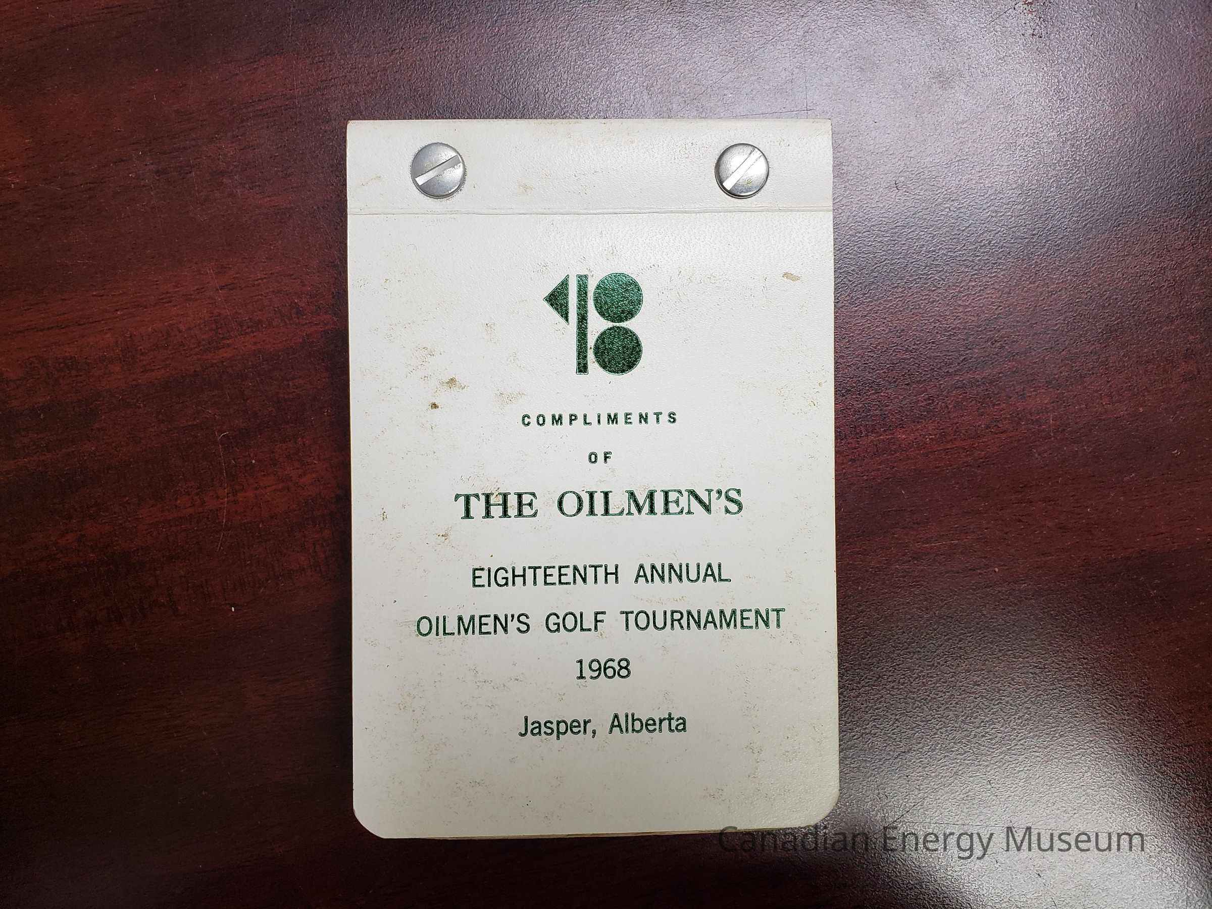 Features: The small pocket-sized booklet is in the style of a notepad, with a top binding. The wrap-around hard-card cover has a lightly textures faux-leather finish, and is secured with two silver-coloured screws. On the front of the cover, in green ink is a stylised "18" with the "1" as a stylised flagstick and the "8" made on two stacked circles. Below this the text "COMPLIMENTS OF THE OILMEN'S EIGHTEENTH ANNUAL OILMEN'S GOLF TOURNAMENT, 1968, Jasper, Alberta.