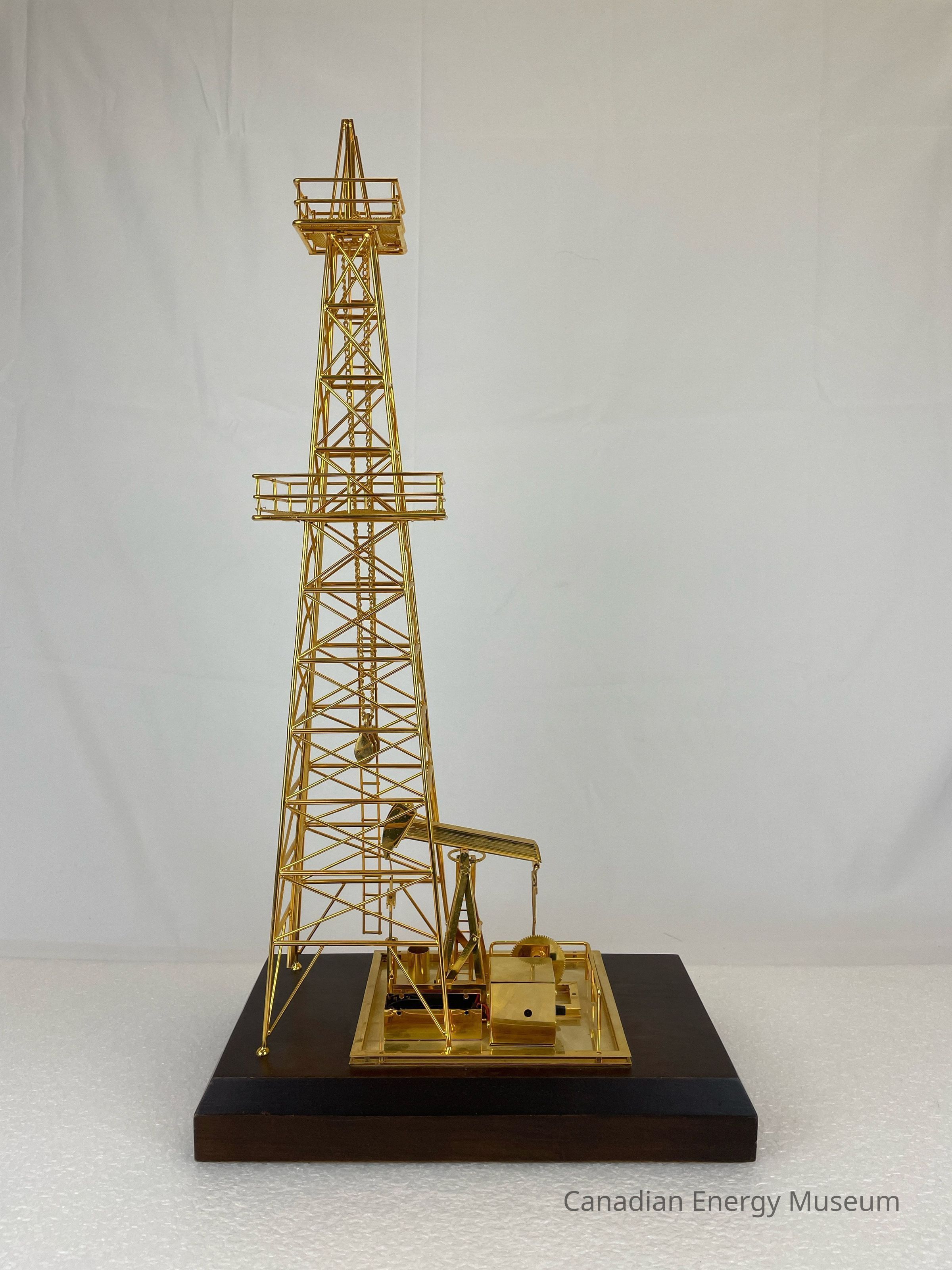 Golden derrick with pump jack overlapping inside. The model is battery-operated, so the pumpjack raises and dips. The wooden base is a dark coloured wood with a gold-plated plaque that reads, "1987 / Dean Caskey / From the Employees of / Key Oilfield Supply & Rentals Ltd." The text on the plaque is etched in a cursive font.Collection