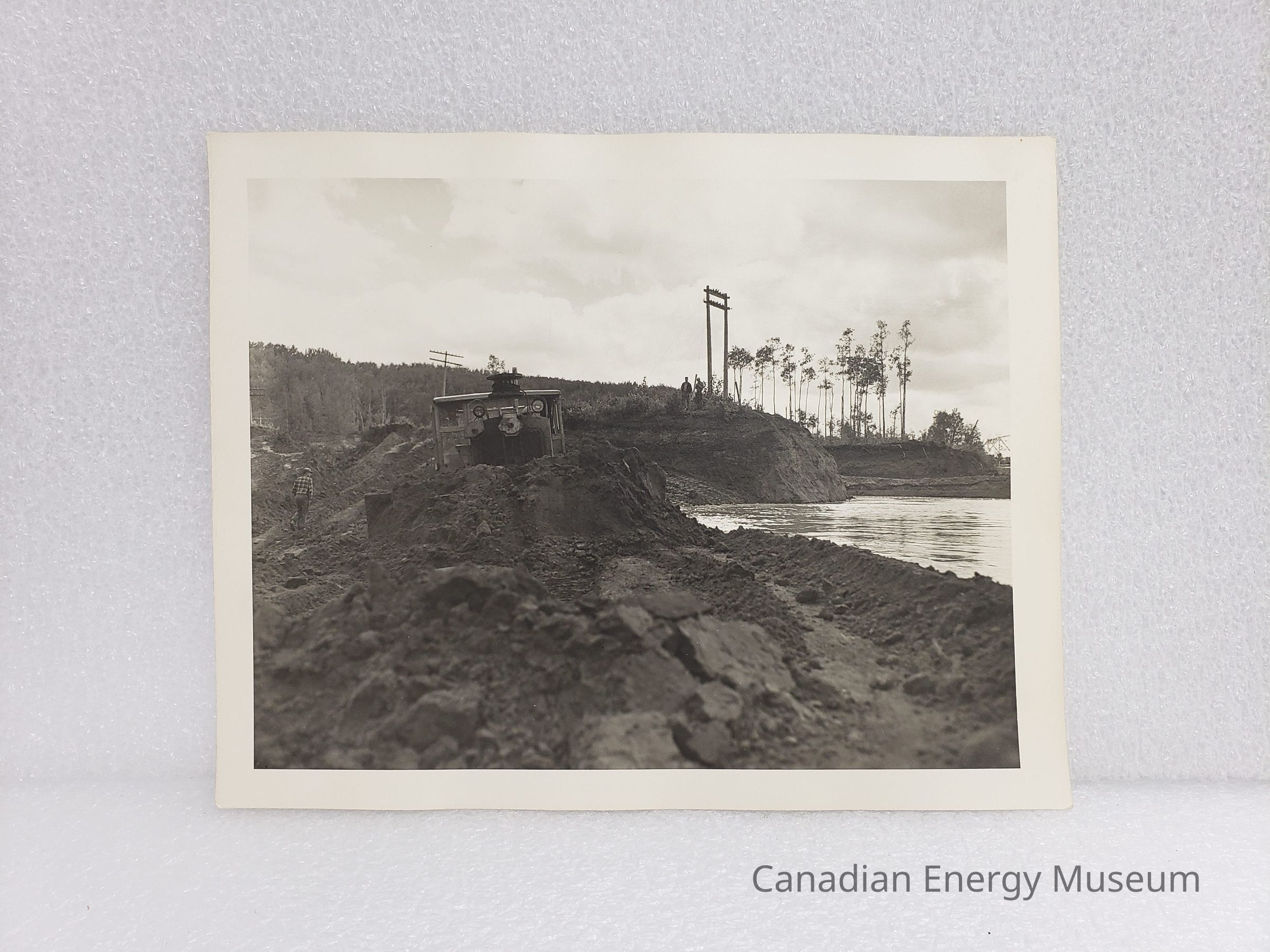 A large, black and white photographic print of a bulldozer moving dirt on the bank/edge of a body of water. In the midground is a bulldozer facing the photographer with a man in a checkered shirt and hard hat facing away. In the background, on a raised section of earth are two figures standing beside a frame supported by wires, with sparse trees further back to the right. To the right midground is a body of water (likely Saskatchewan River based on other photos in the collection). On the reverse is a stamp for Smith Photographers ("Phone 212, Devon, Alta.").Collection