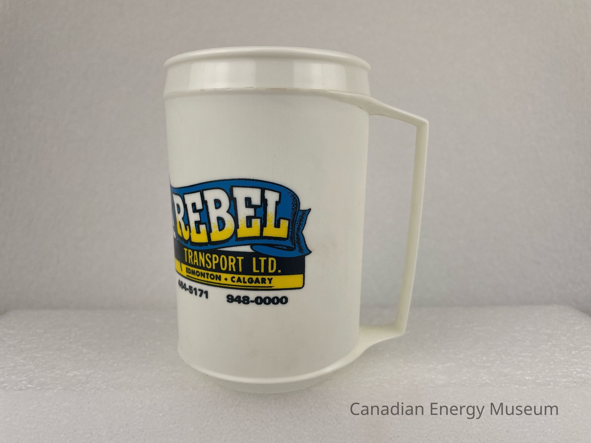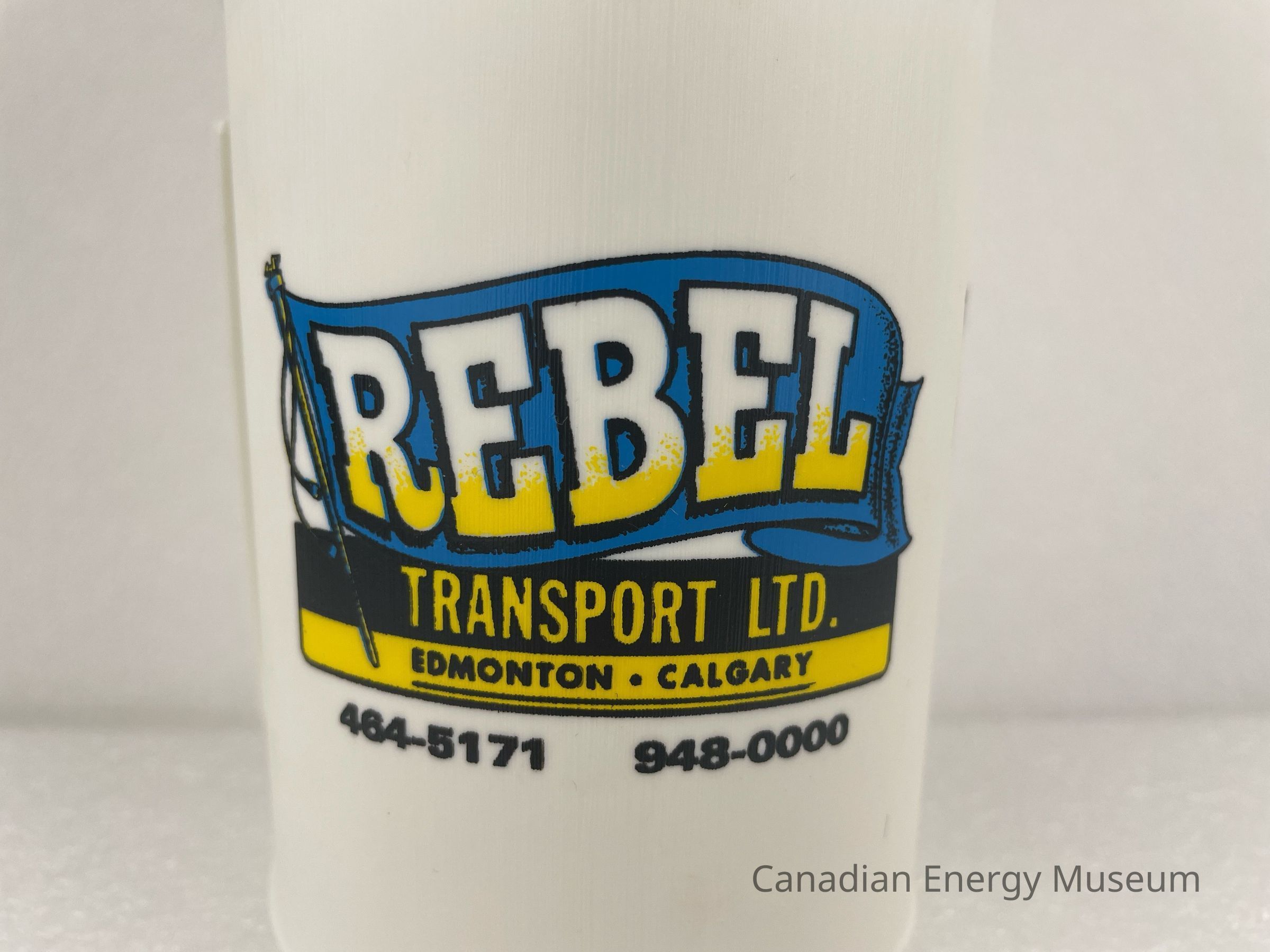 [Travel Mug] Rebel Transport Ltd., Edmonton, Calgary, Plastic, White Blue YellowEntry/Object ID