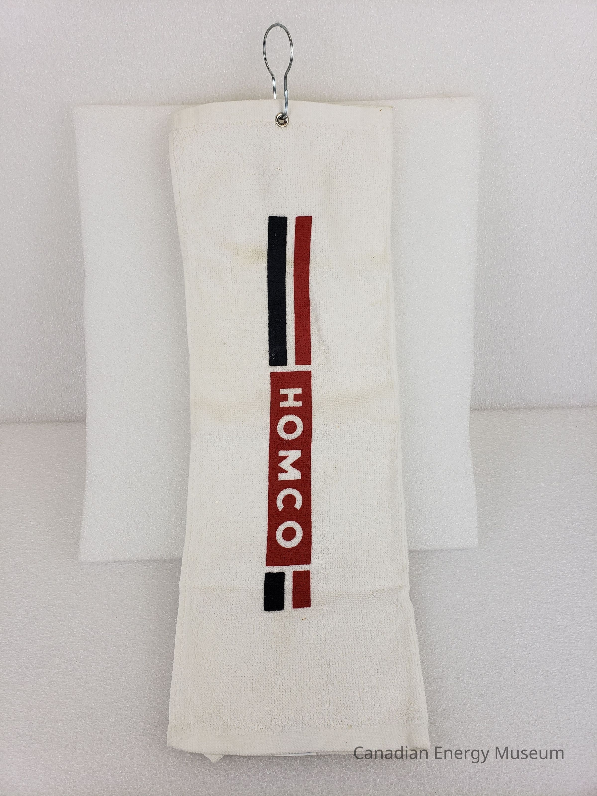 Design: A white terry golf towel, with the Homco text logo printed in two places. Running vertically along the left side of the two is the larger of the two logos, with a red and black band to either side. The second logo is smaller, and runs horizontally at the bottom of the right side of the towel. The material is of a medium-weight thickness, and the towel is bi-folded vertically. A silver eyelet is set through the centre-top of the folded towel, through which is a matching pear clip.
