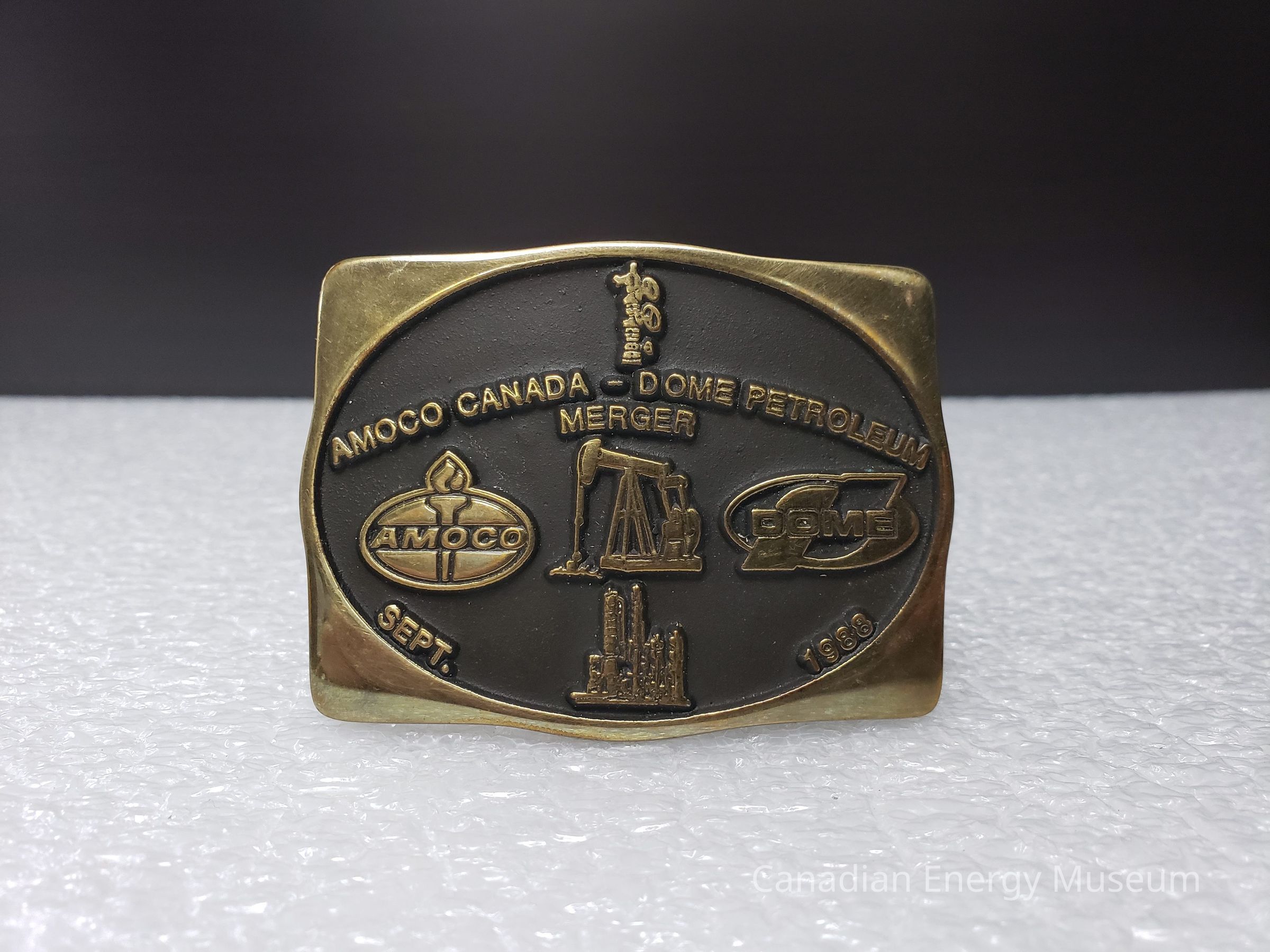 Rounded-rectangular belt buckle, branded to the 1988 Amoco Canada and Dome Petroleum merger.