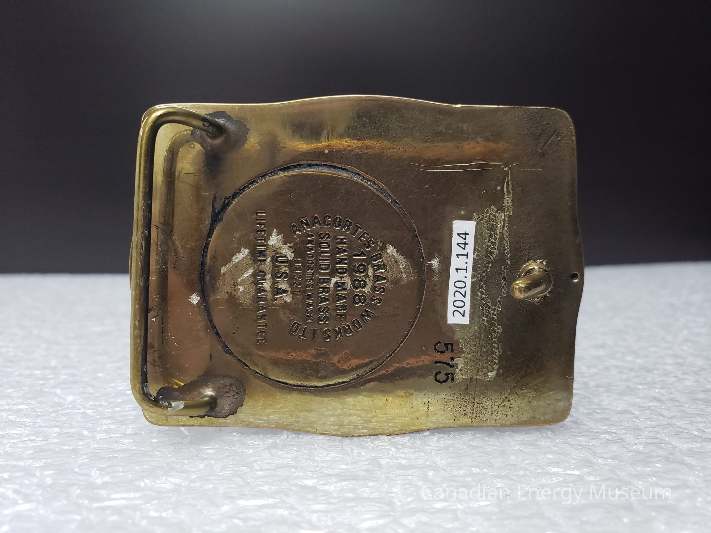 Old Description (Kelsey Dalrymple, 3 June 2020): Amoco Canada - Dome Petroleum Merger September 1988. Rectangular brass belt buckle. #575. (Donated by Jim Beamish).Collection