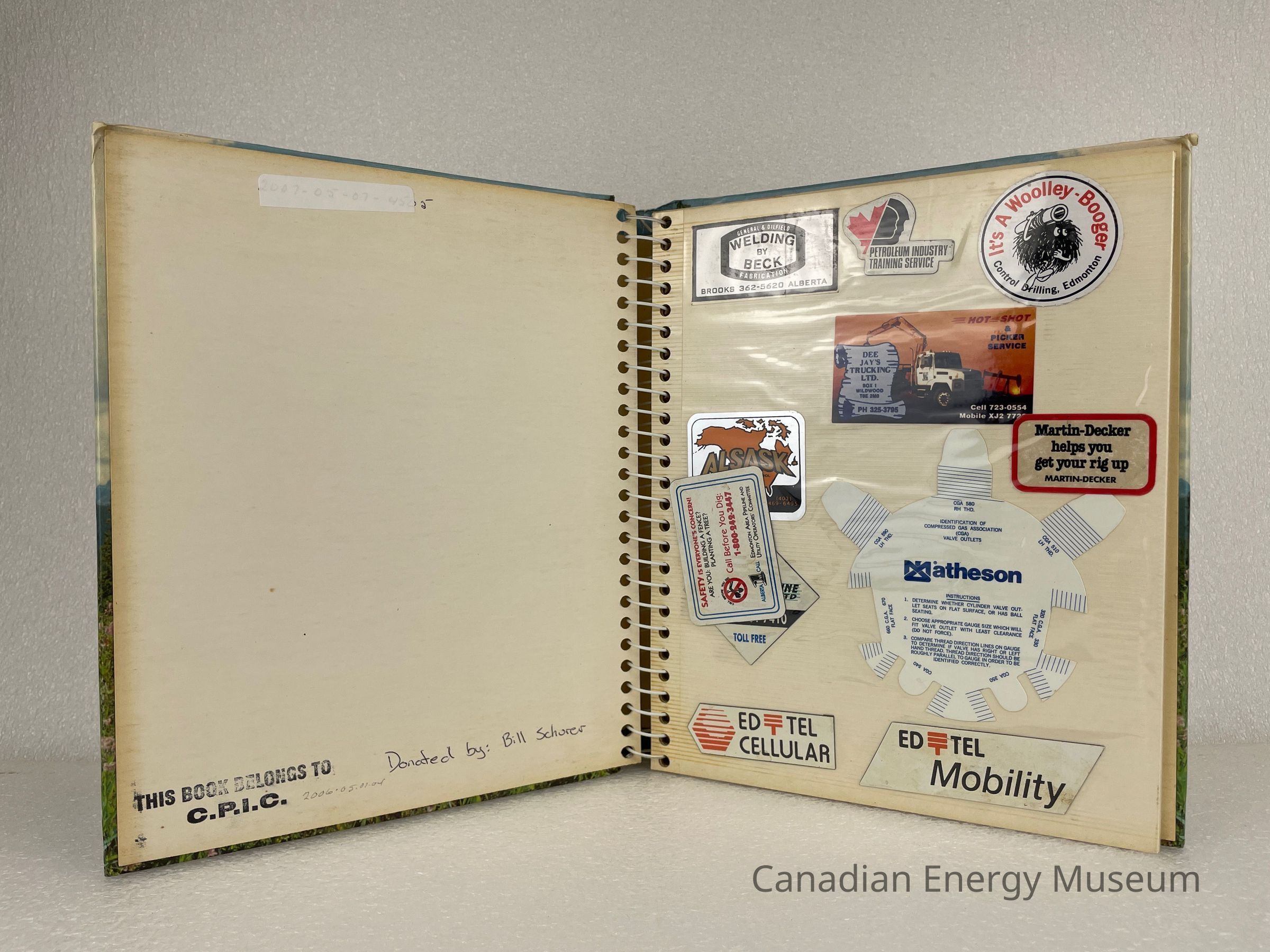 A photo album of assorted photographs and stickers. The cover features an image of a rocky mountain scene with greenery, trees, and pink flowers. 6 sheets are held within a white metal coiled binding. The inside cover displays a black stamp reading, "THIS BOOK BELONGS TO C.P.I.C." and handwriting in black pen reading, "Donated by: Bill Schurer".Collection