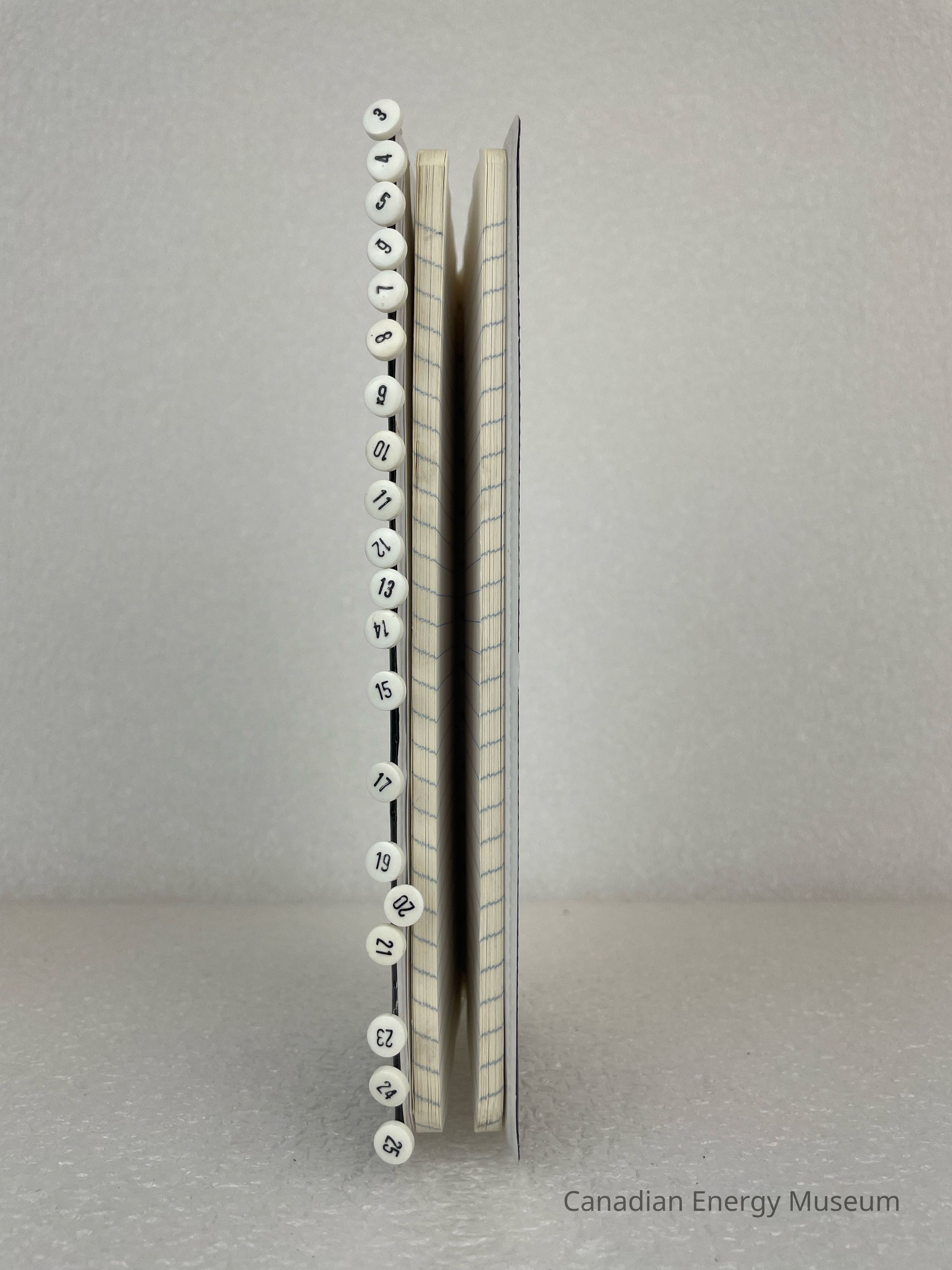 The tally book is long and thin with a black cover and white text. The top of the front cover displays a small red rectangle with white text underneath reading, "Tally Book". The centre features a red and white logo design of an oil derrick with white text reading, "SMITH DRILLING & COMPLETIONS". At the bottom in a smaller font size is text reading, "A-Z SERVCO", "DRILCO . GRANT", and "LINDSEY". The back of the book is plain, with small text at the bottom, with the Smith Drilling & Completions information. The side of the front cover has twenty metal pins with white caps. Each pin has a different number from 3 to 25. The numbers 1-2, 16, and 22 are missing.