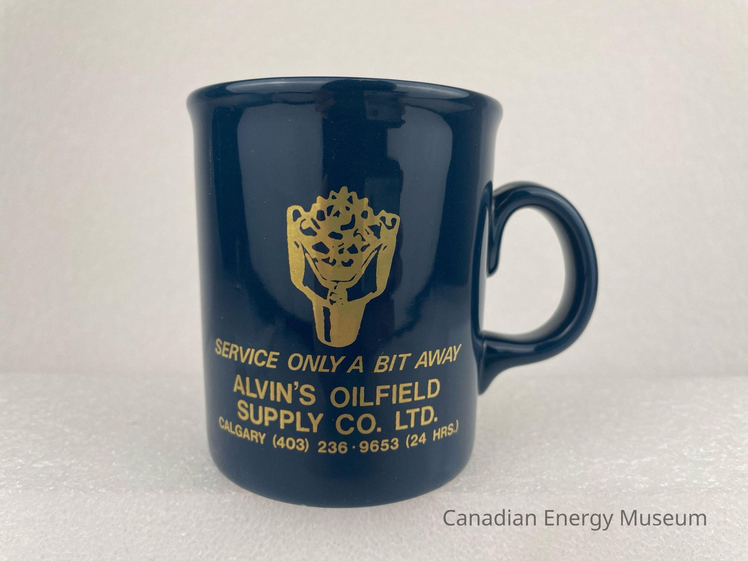 A navy ceramic mug with a handle branded to Alvin's Oilfield Supply Co. Ltd. The front of the mug features a gold illustration of a drill bit with gold text underneath reading "SERVICE ONLY A BIT AWARD / ALVIN'S OILFIELD SUPPLY CO. LTD." with smaller text at the bottom reading, "CALGARY 9403) 236 . 9653 (24 HRS.)". The bottom of the mug is raised text reading, "MADE IN ENGLAND".Collection