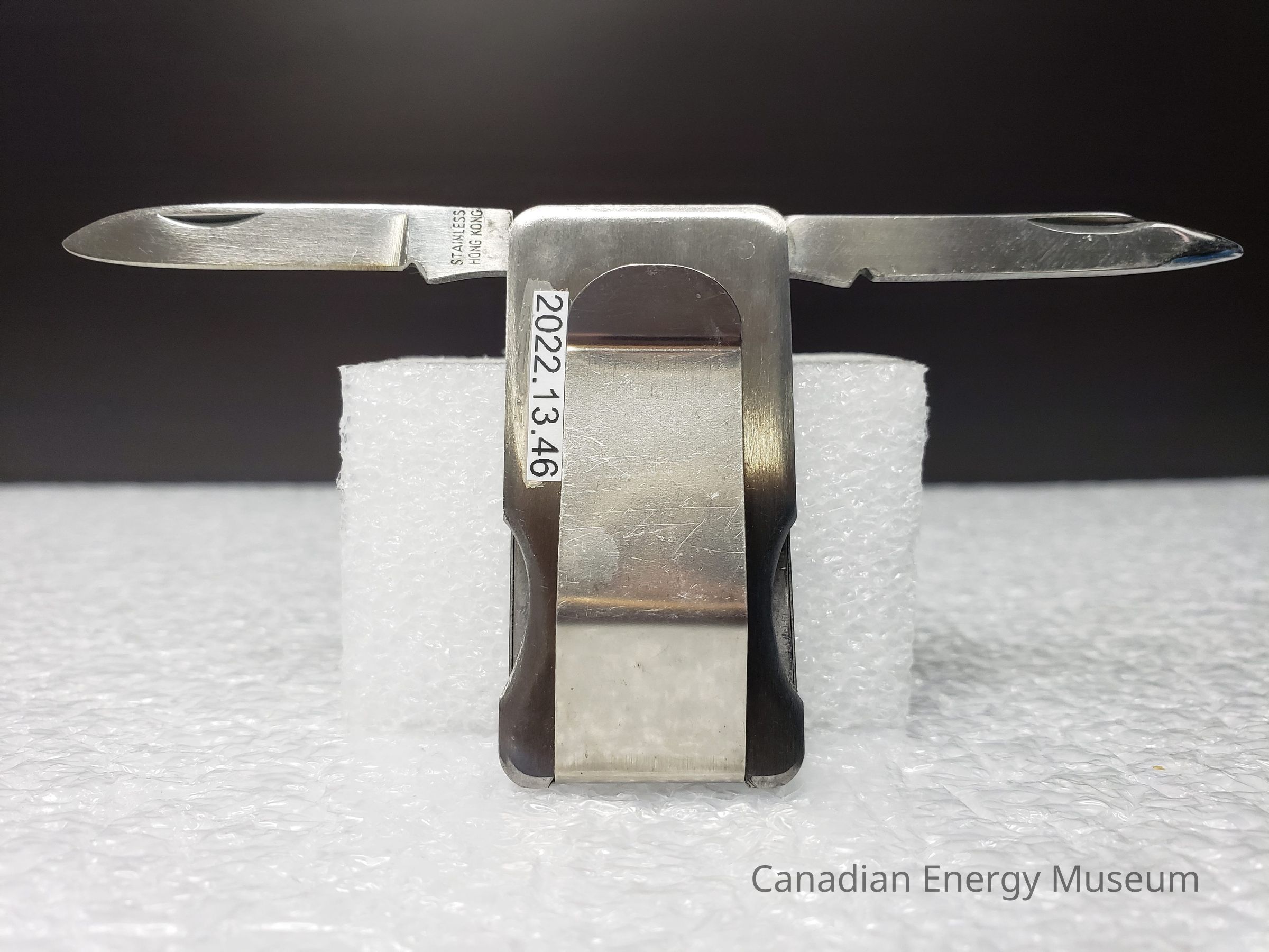 Old Description(Kelsey Steil, 6/1/2022): Square folding penknife with two knives. White advertisement with blue text on face for Stan's Power Tong Torque/Turn Service Co. Ltd. Belt clip on one side.Collection
