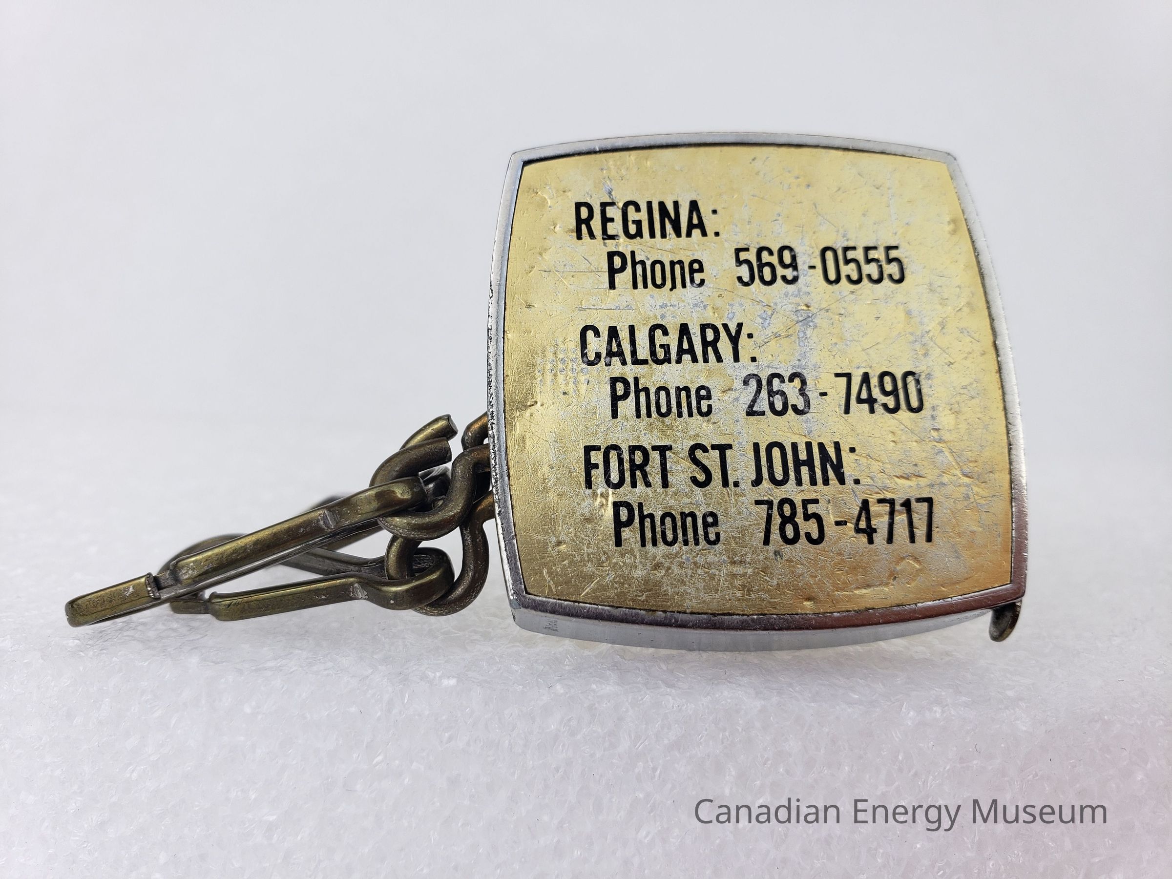 Description: A rounded square mini tape measure, with three snap-hook clasps attached. On the front surface is a label with a metallic yellow-gold base with metallic silver silhouette of North America. Over this, in black, is printed "OIL FIELD SALES & RENTALS; OIL PATCH; Edmonton; Alberta, Canada". On the reverse, over a metallic gold base, is printed "REGINA; Phone 569-0555; CALGARY; Phone 263-7490; FORT ST. JOHN; Phone 785-4717".Collection