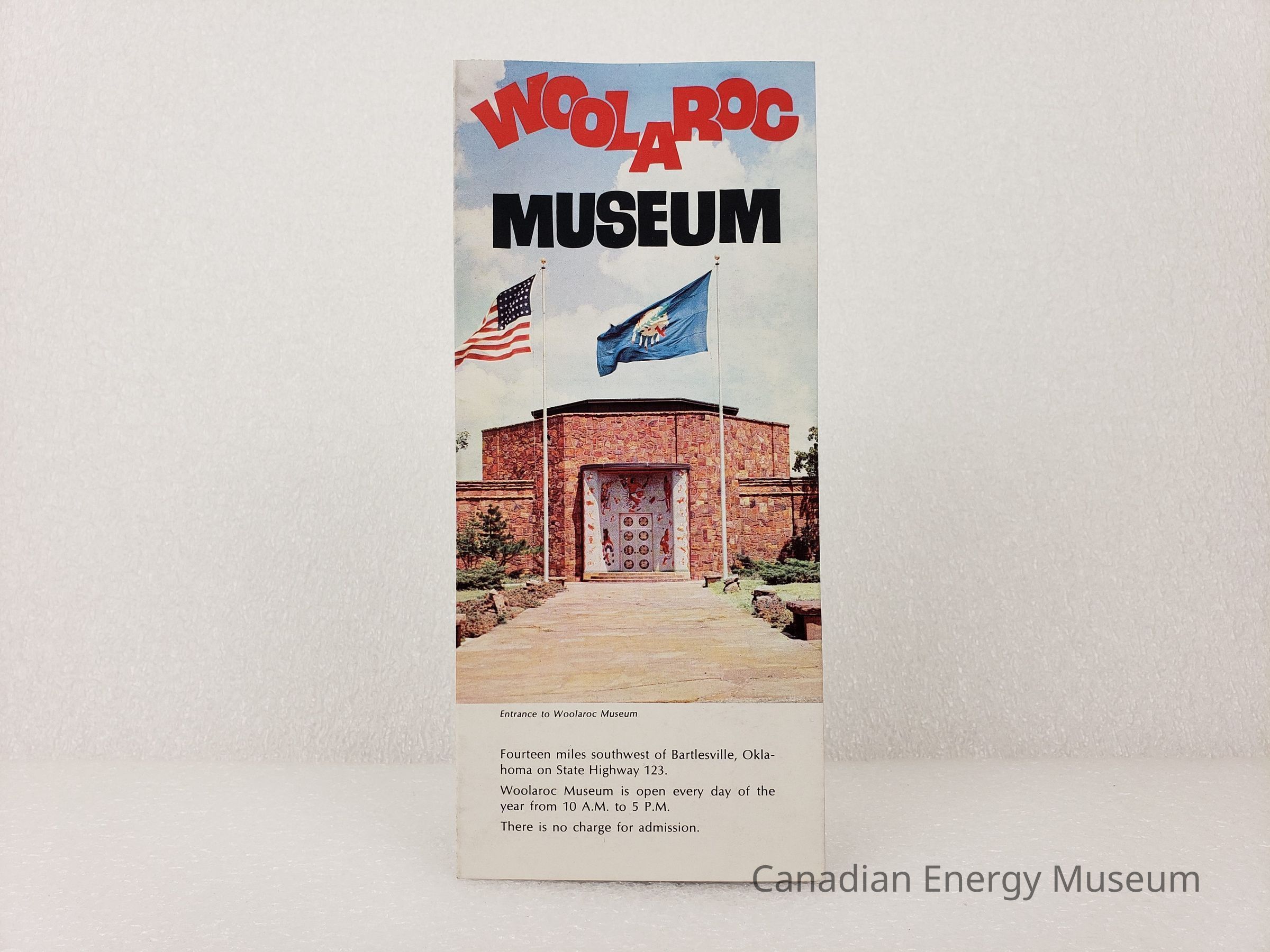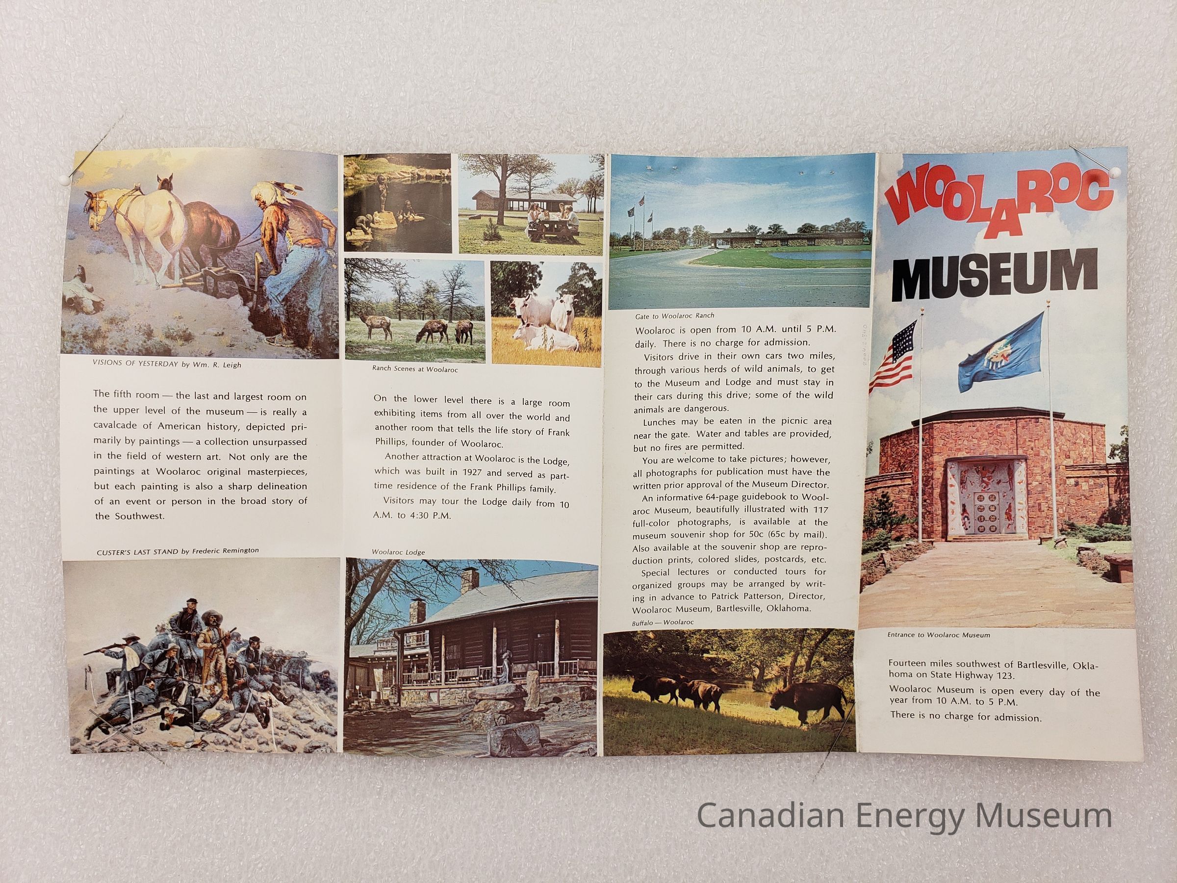 A pamphlet for the Woolaroc Museum, Bartlesville, Oklahoma. Features a history of the museum and admission information.