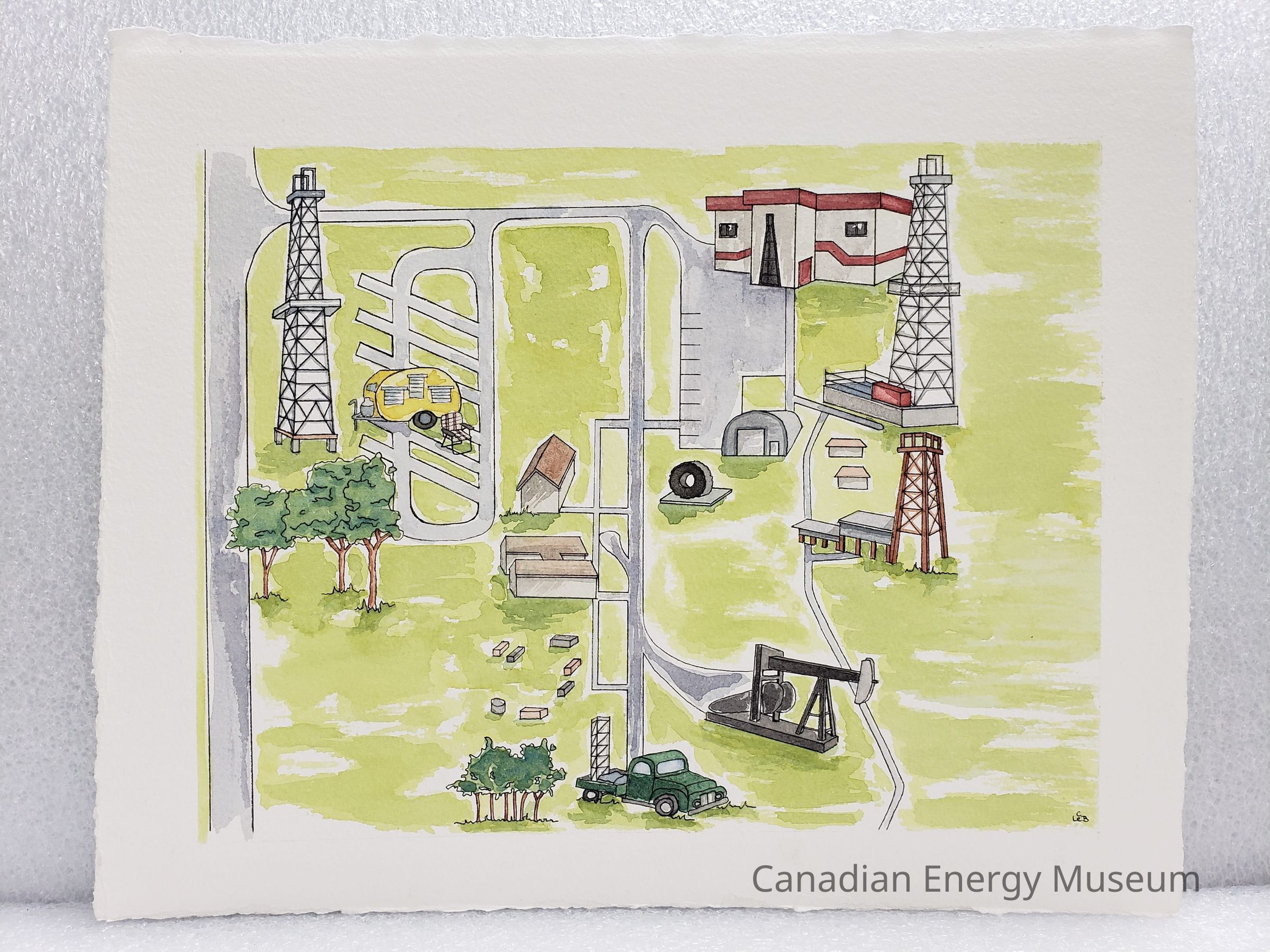 An original stylised illustration of the museum's grounds. Shows the museum building, three derricks, the campground, Atco and MI Safety buildings, a pumpjack, and service truck. Outlines done in black ink, with colouring done with watercolours.