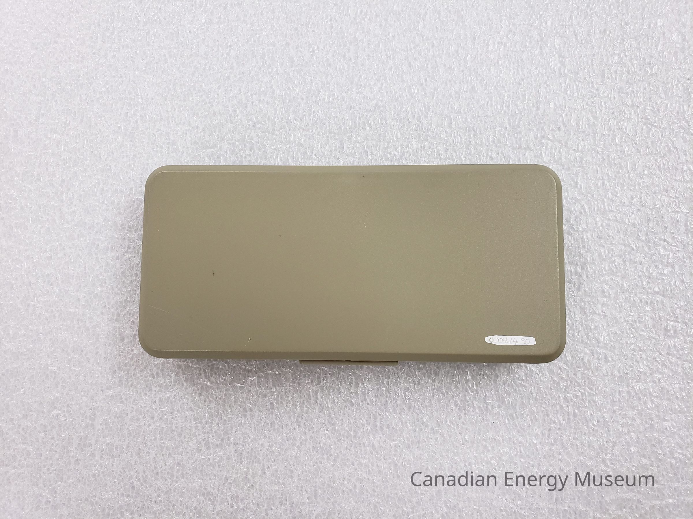 The exterior is a rectangular hard clam-shell. The plastic khaki and lightly textured. The case opens on a simple two-piece hinge, with a front clasp (pressed in to release lid and open). On the top of the exterior (centred) is the Texaco logo (red circle, with an interior uncoloured/khaki star and red "T" within the star) to the left, and the following text in red to the right: "Texaco Trading and Transportation Inc". In the bottom-right is also a radial line design in gold.Collection