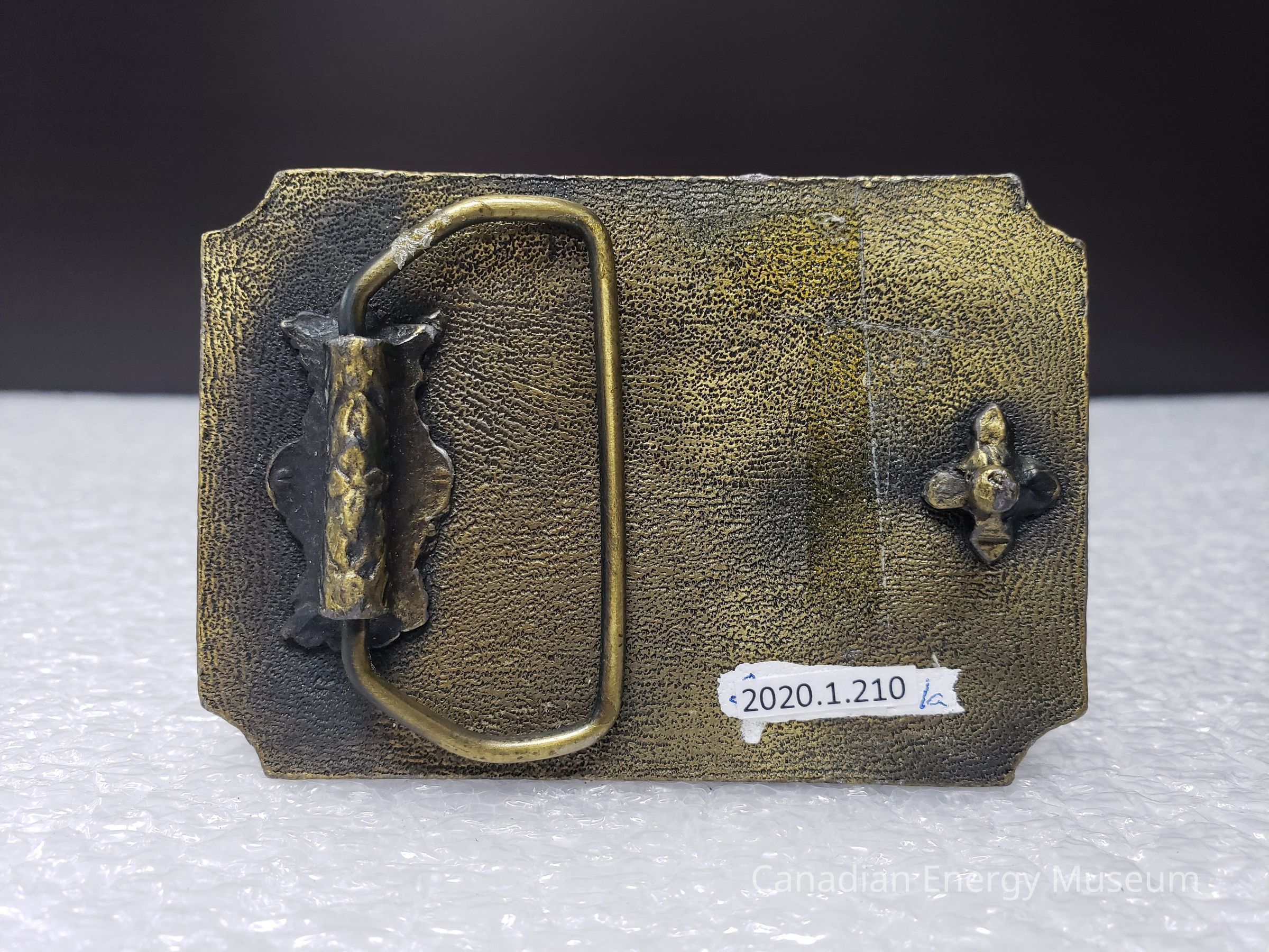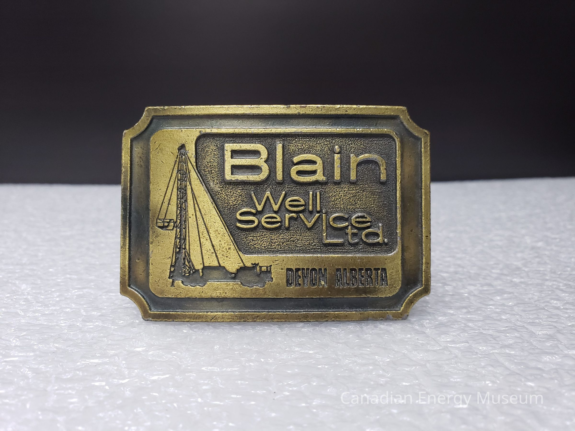 Old Description (Kelsey Dalrymple, 6/3/2020): Blain Well Service Ltd. Devon, Alberta. Brass rectangular belt buckle. Service rig on left.Collection