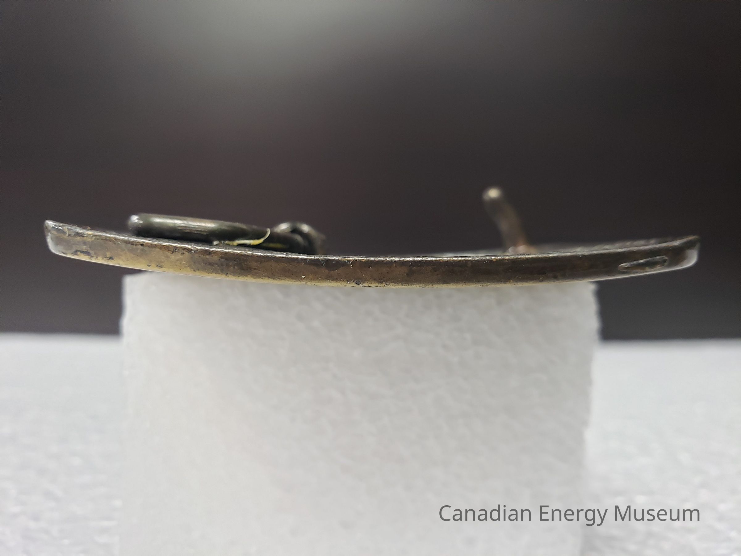 Back: The back of the belt buckle has discolouration and rust spots overall, mostly towards the centres and corners of the buckle. Adhesive residue patches on the right side beside the hook, and along the left side, where the hinge lies. Hinge has adhesive residue on it.Mechanism