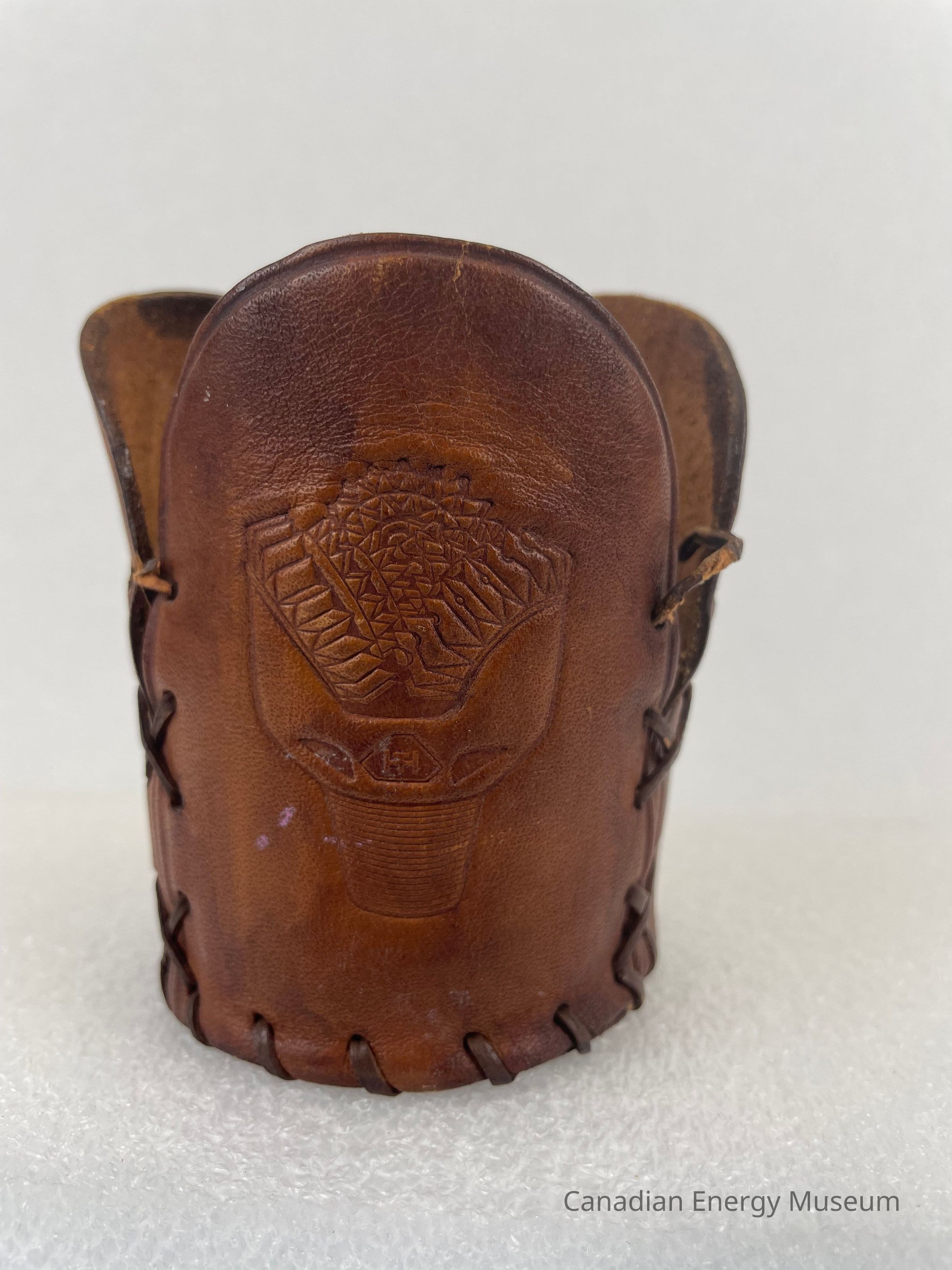 Description: A leather glass koozie, made by Hughes Tool Company. The koozie is made up of four different leather pieces. The bottom is a circular leather piece, and the interior features an engraved logo of a triangle with the letters "HT" in the centre. The sides are made up of three rounded rectangular shapes, each with identical engraved drill bits. The pieces are stitched together with brown leather string.Collection