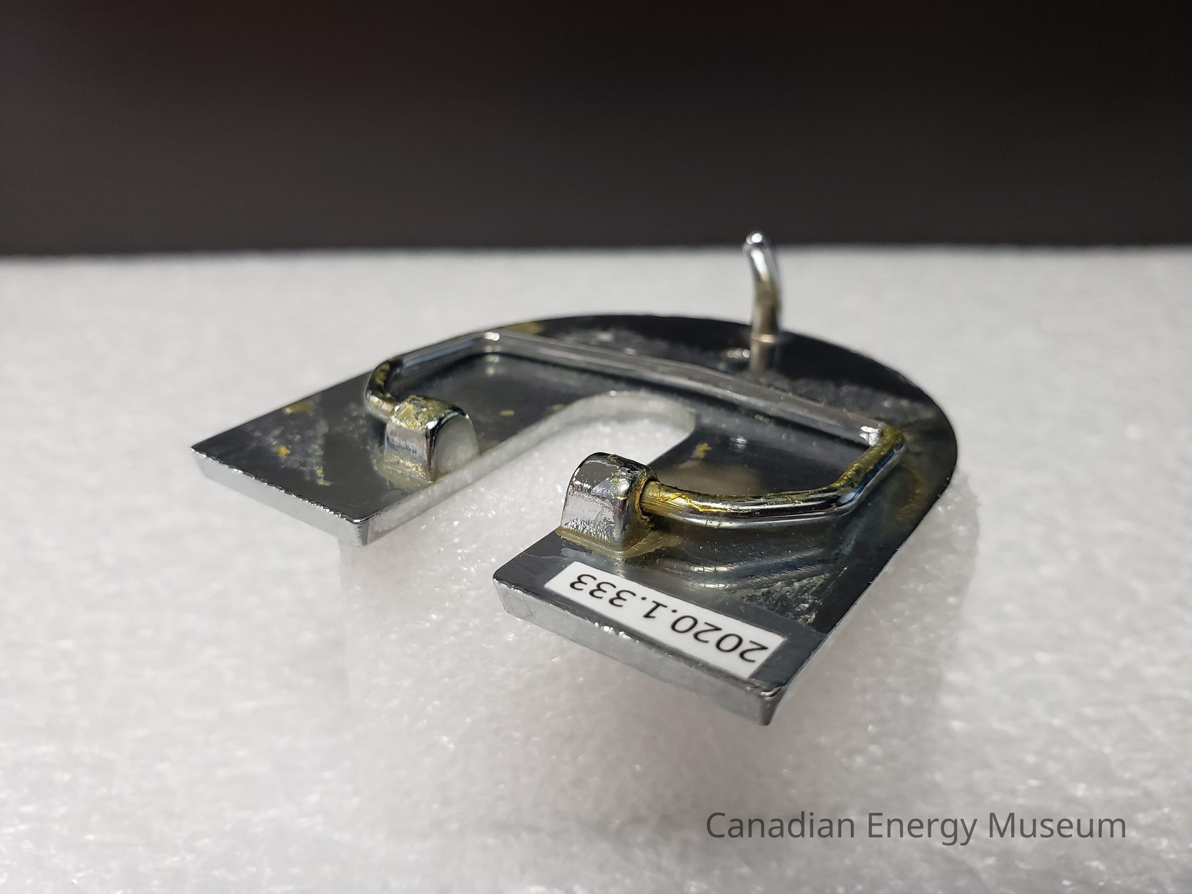 Old Description (Kelsey Dalrymple, 6/3/2020): Cummins. Steel belt buckle in the shape of a C with blue enamel text.Collection