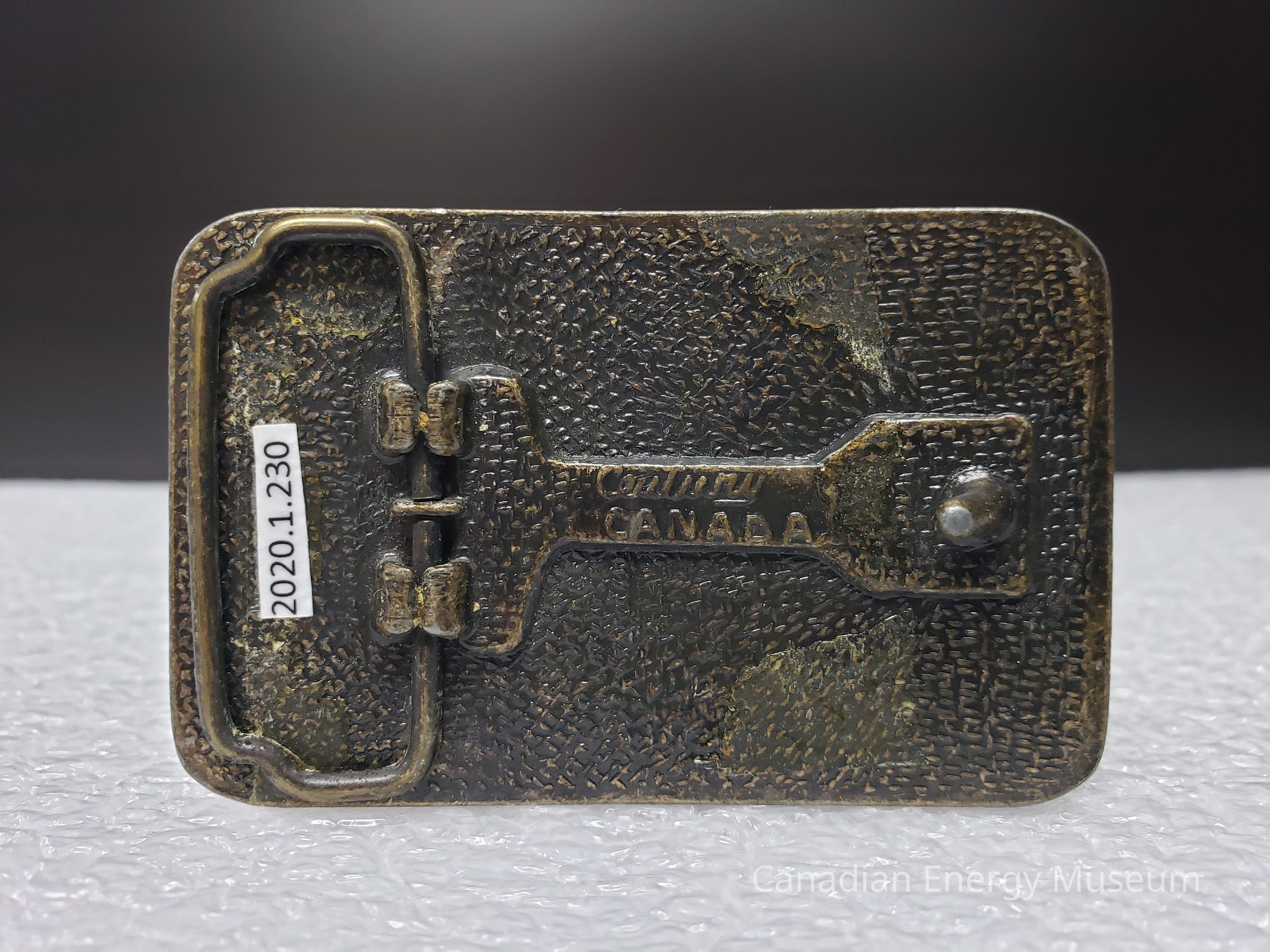Old Description (Kelsey Steil, 4/7/2021): "B & R Transport (Bonnyville) Ltd. Brass belt buckle with leather face."Collection