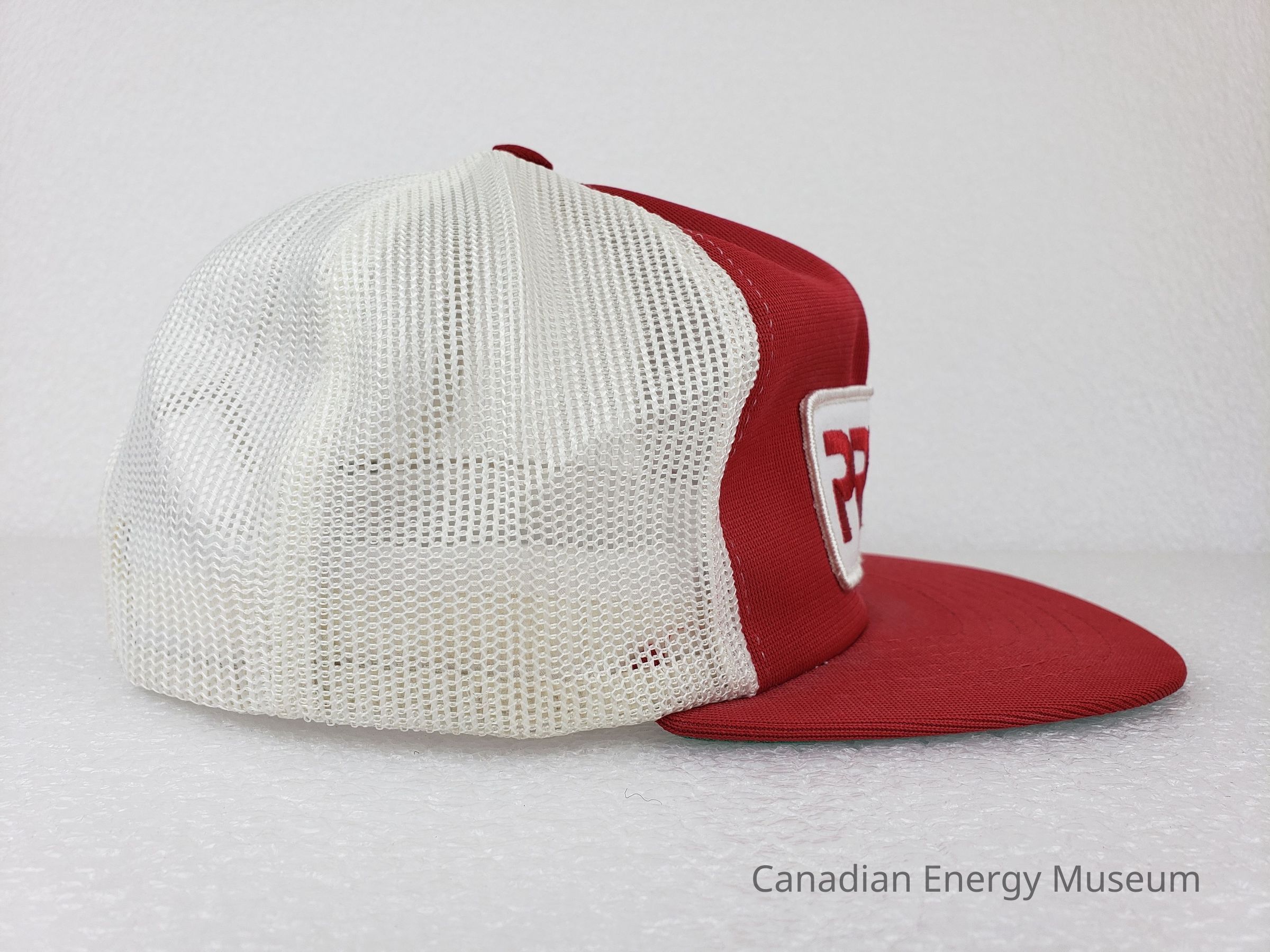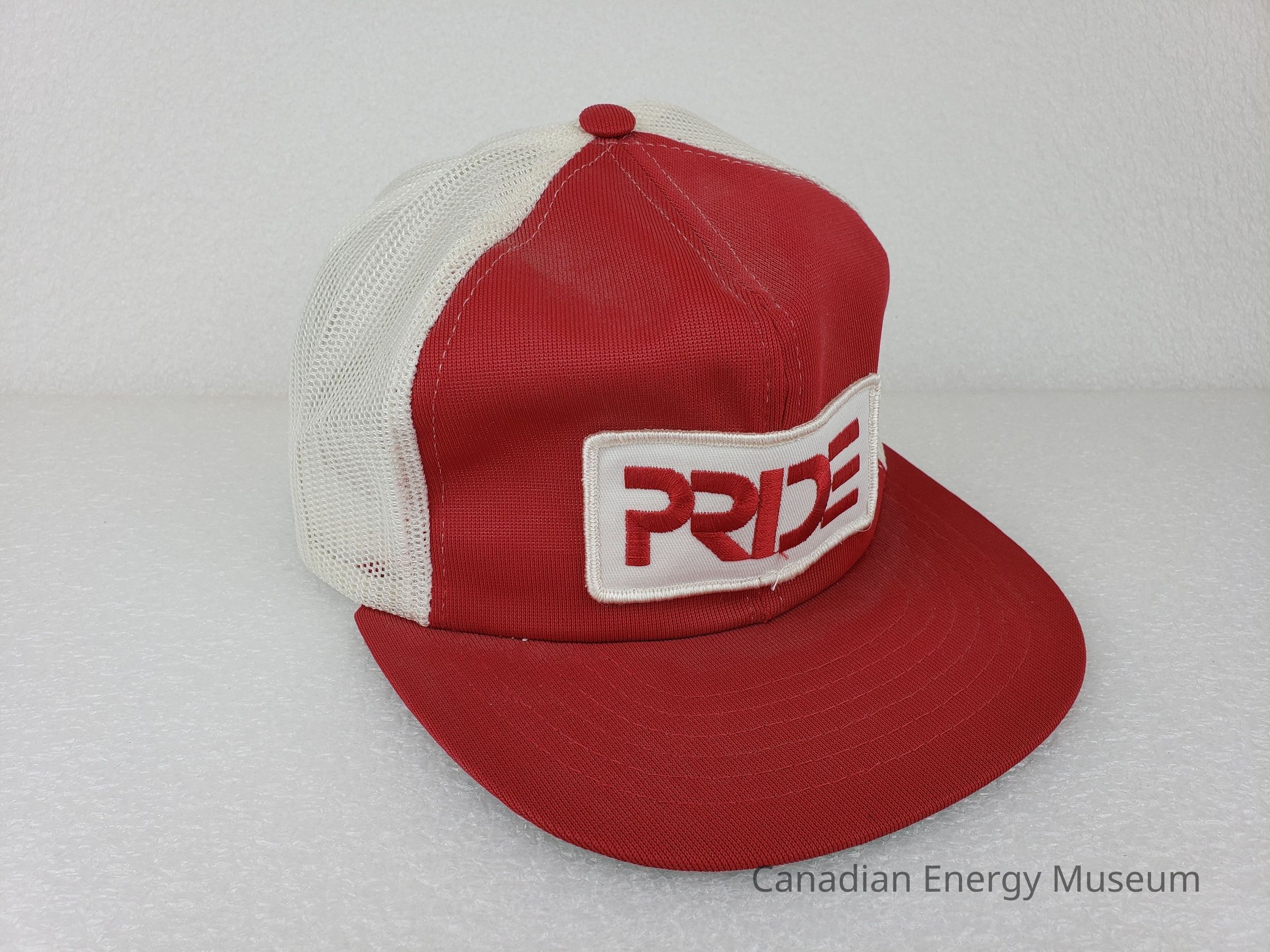 Design: A red fabric crown with a rectangular patch branded to Pride. The patch design features a white base with white edge embroidery. The patch displays large, red embroidered text, "PRIDE". The text style is sans serif, and the letters are incomplete and have 'missing' lines.
