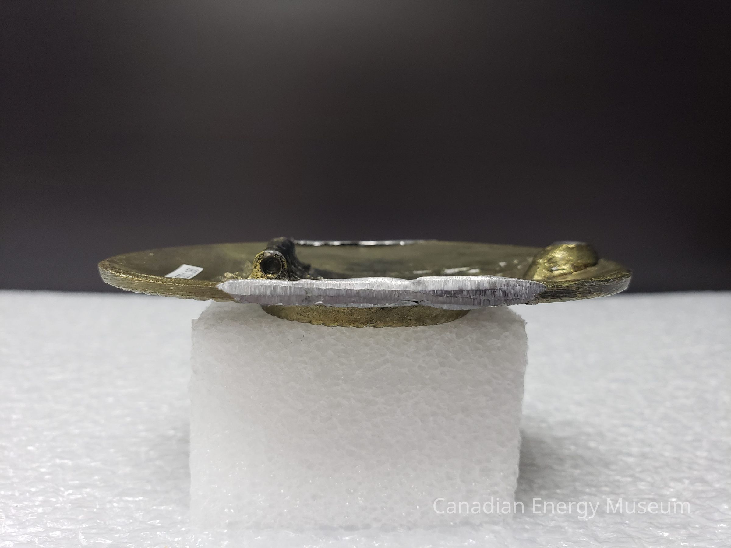 Old Description (Kelsey Dalrymple, 3 June 2020): Baker Oil Treating. Oval brass belt buckle with circular white enamel face. Blue text. Top and bottom edges have been cut away. (Donated by Gordon McQuaig).Collection